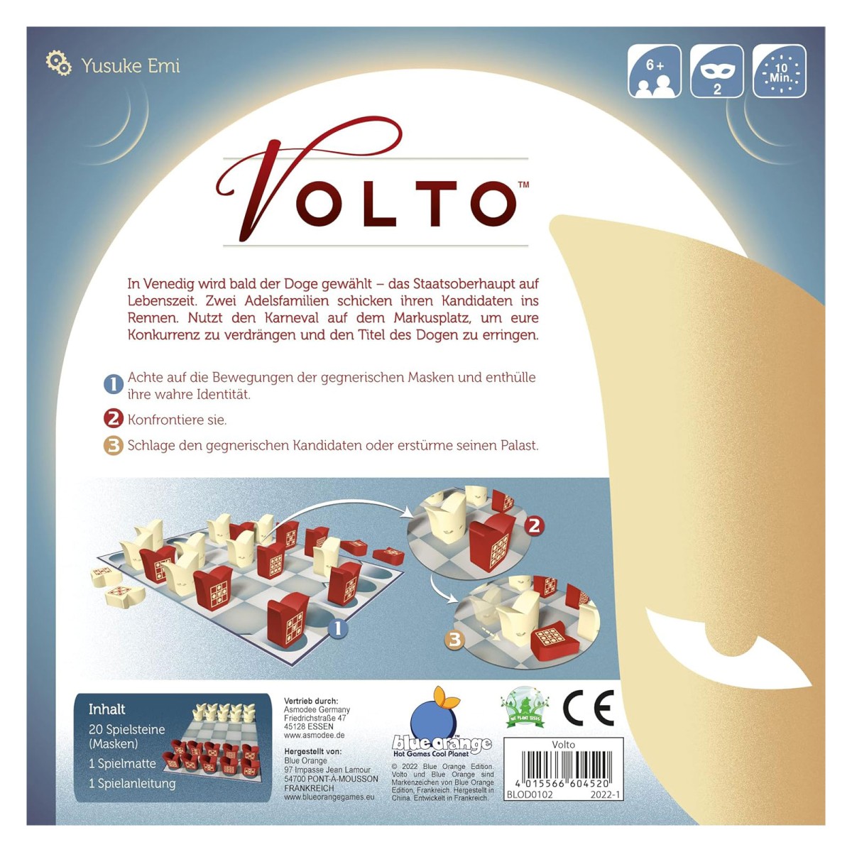 Volto ist ein kurzweiliges, abstraktes Bluff-Spiel für zwei Personen. In einem spannenden Duell konkurriert ihr darum, auf dem Karneval von Venedig den Titel des neuen Dogen zu erringen. Dabei versucht ihr, die Figuren des gegnerischen Spielers zu schlagen, ohne zu viele der eigenen zu verlieren. Die Identität der Figuren bleibt allerdings geheim, bis sie angegriffen werden. Daraus ergibt sich ein taktisches Tauziehen, das Spannung bis zur letzten Minute verspricht.