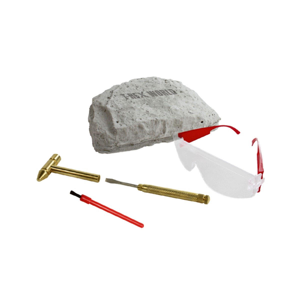 Schutzbrille, Metall-Hammer, Metall-Spatel, Pinsel, 11-teiliges Skelett im Gipsblock, Anleitung