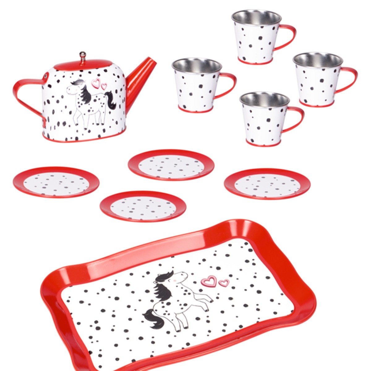 Die typischen Punkte finden sich auf allen Bestandteilen dieses Spiel-Geschirrs wieder. Wenn einmal ein Teller oder eine Tase herunterfällt, macht das gar nichts! Da alle Artikel aus Metall sind, wird's zwar laut, aber nichts geht zu Bruch.