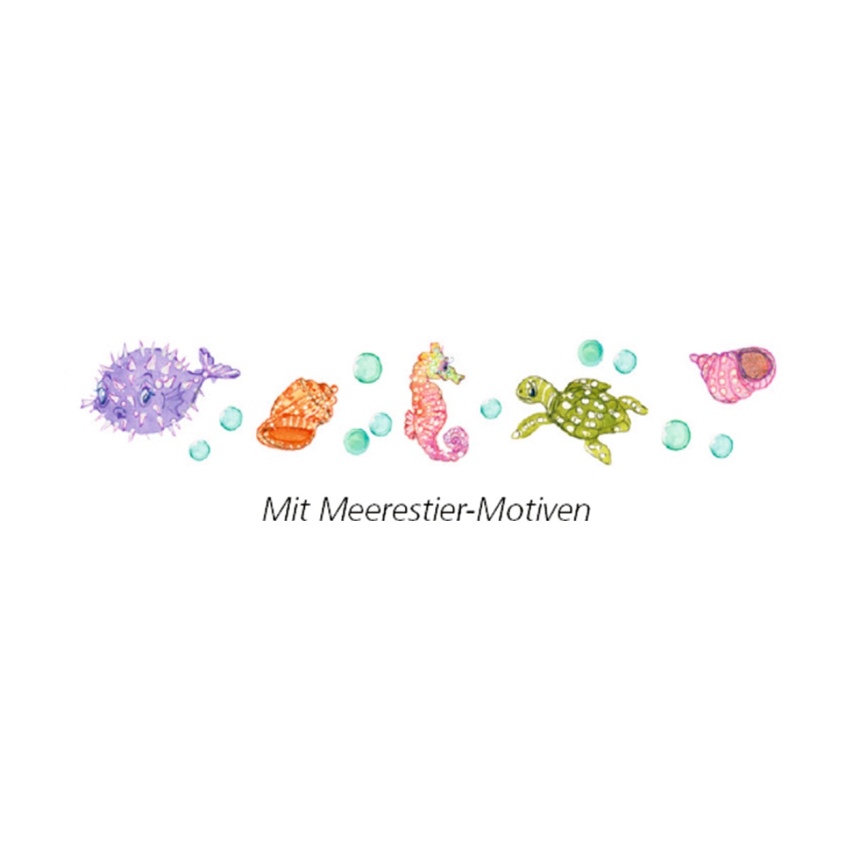 Gefüllt mit farbigen Motiven und schwimmenden Glitzerpartikeln, die im Licht golden und in Regenbogenfarben funkeln. Neben den Glitzerpartikeln sind auch noch Meerestiere im Stab zu finden.
