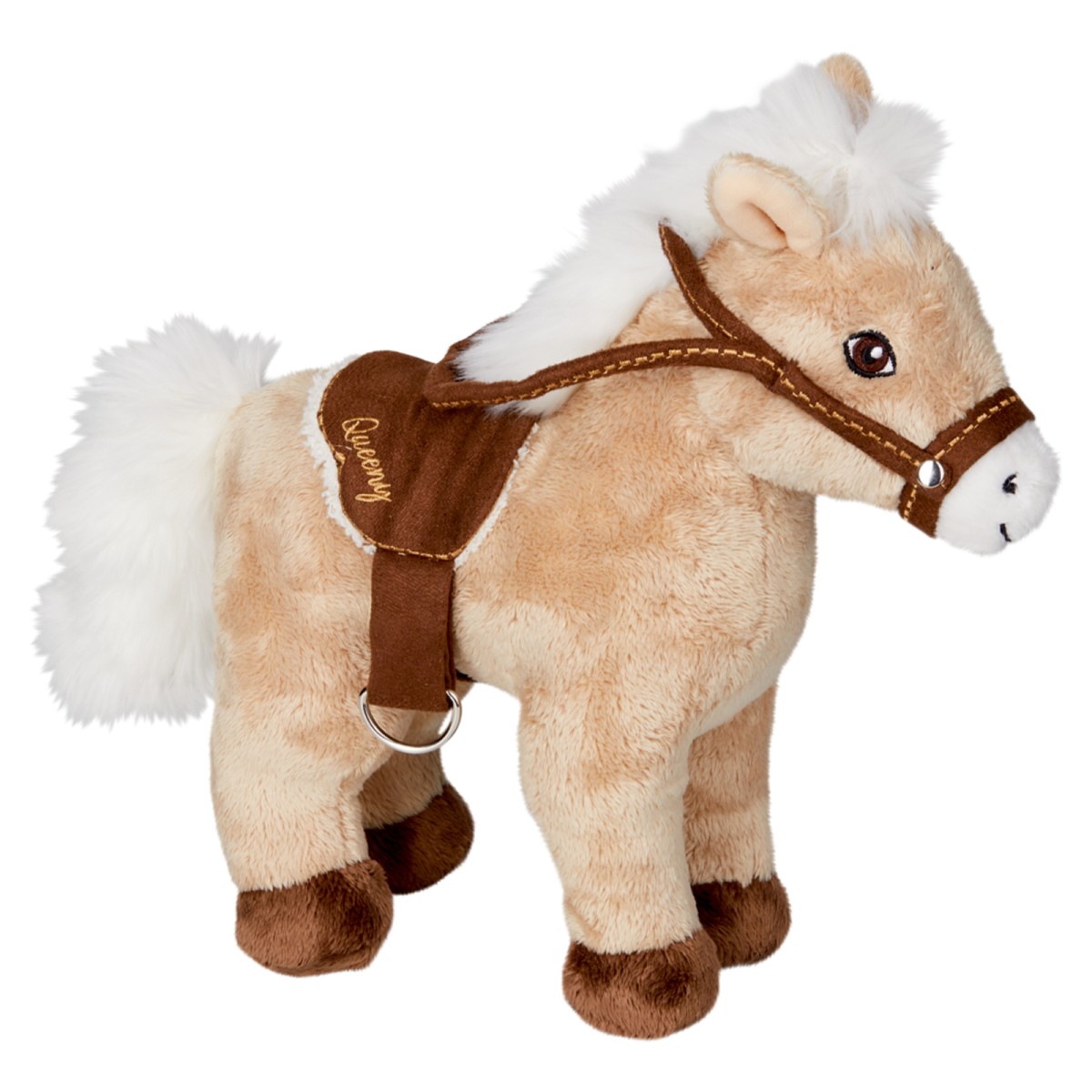 Zu ihrem hellbraunen Fell gesellt sich eine weiße, buschige Mähne. Neben einem abnehmbaren Sattel, der ihren Namen auf der Seite trägt, gesellt sich noch ein Halfter dazu.