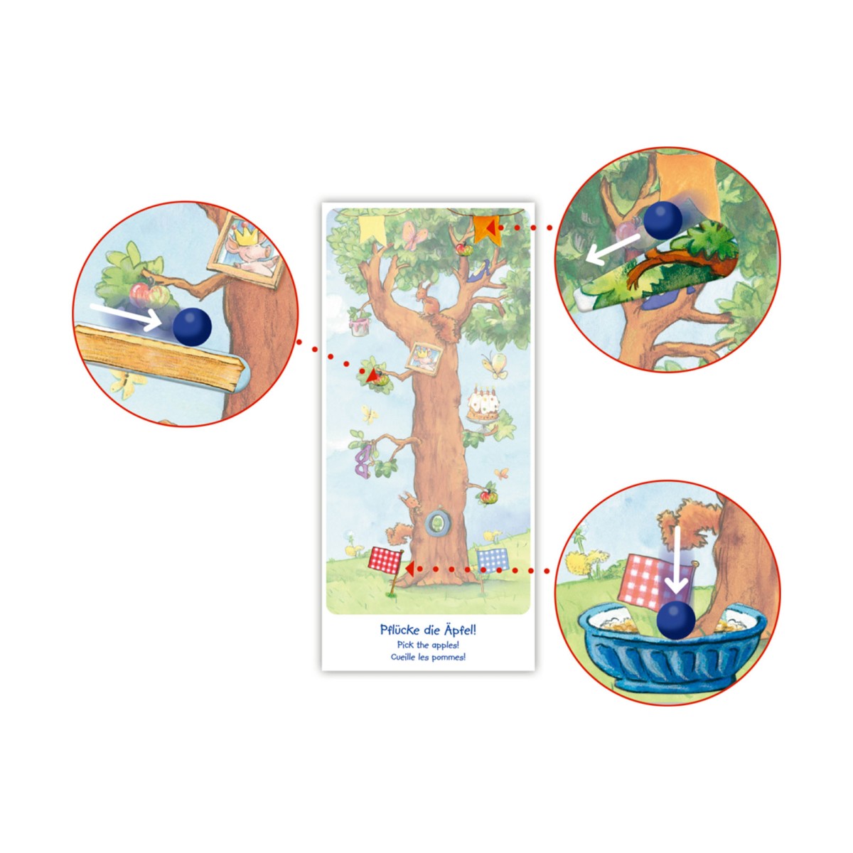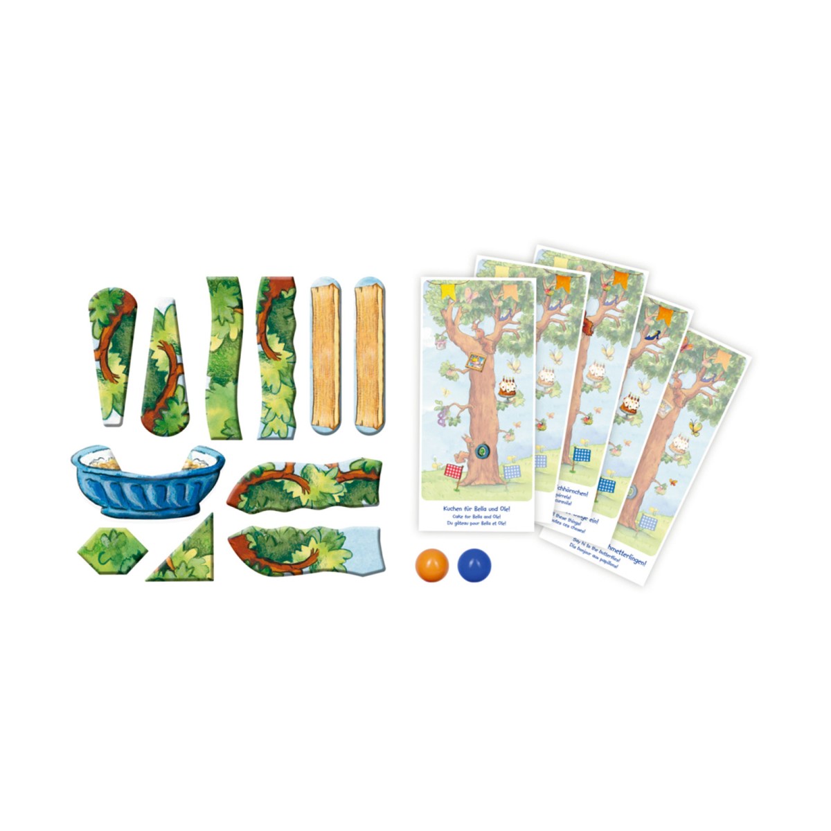 1 Kugelbahn, 11 Magnete, 2 Kunststoff-Kugeln, 5 Spielkarten