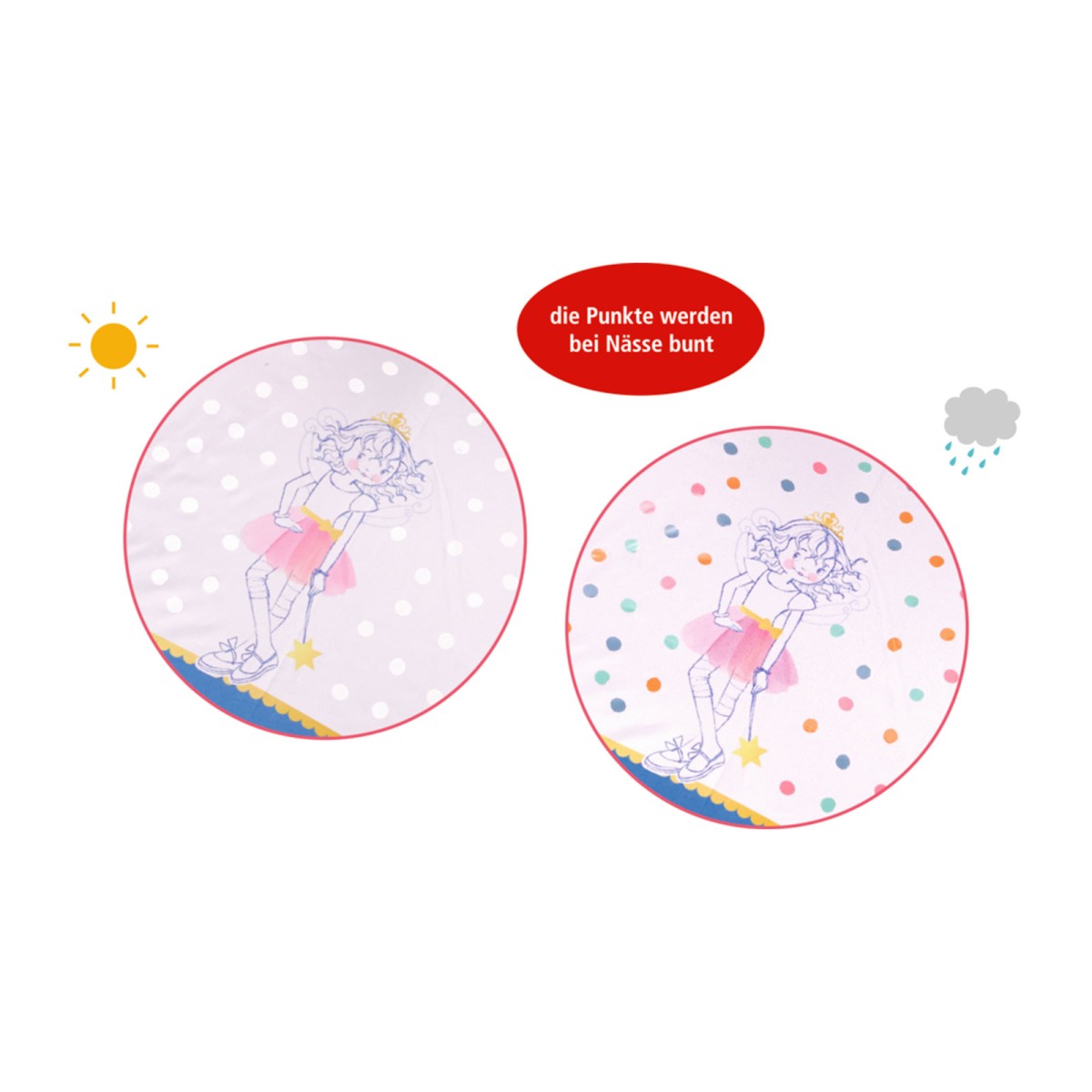 Bei Nässe färben sich die Punkte wie von Zauberhand bunt!