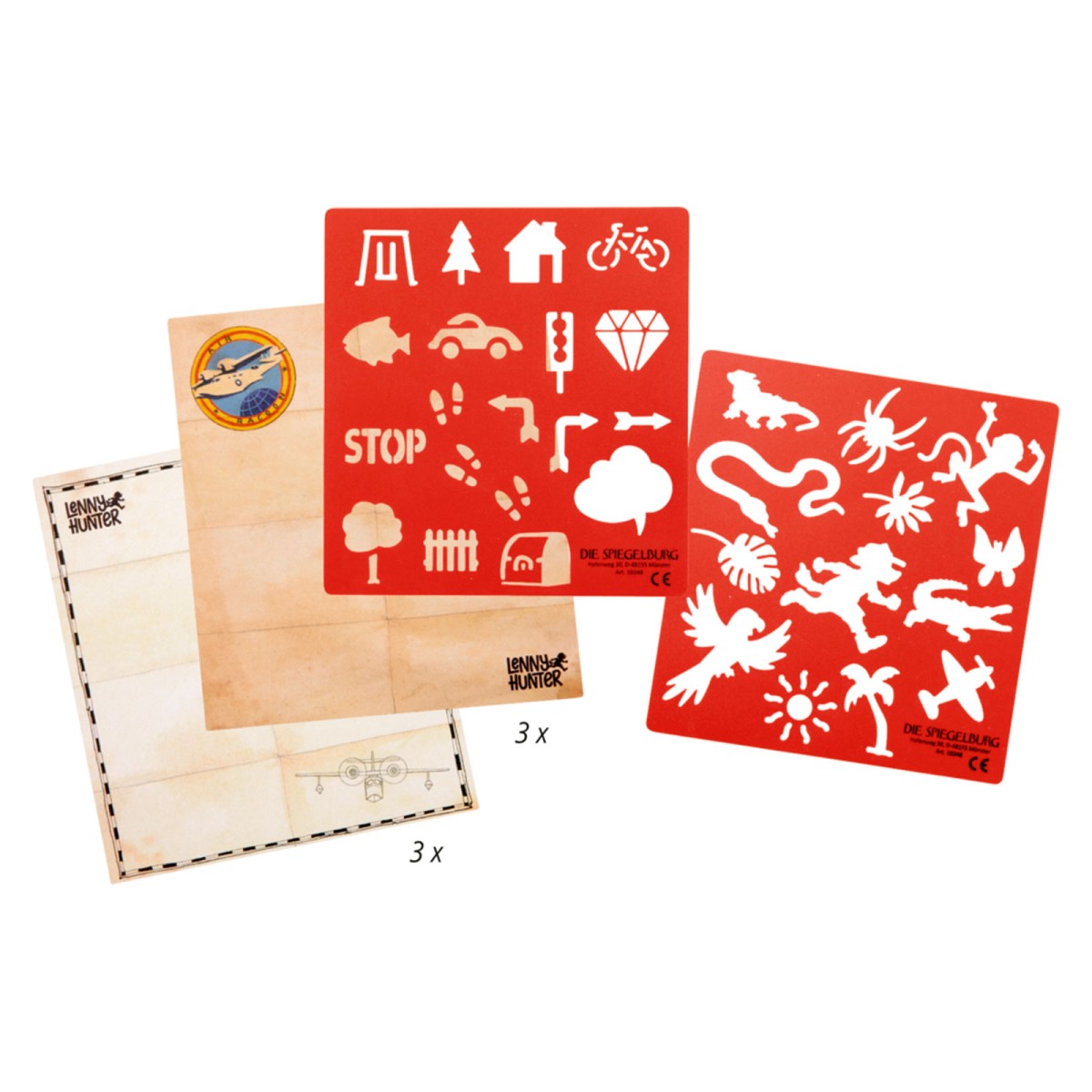 2 Geheimschrift-Stifte, 6 Schatzkarten, 2 Schablonen