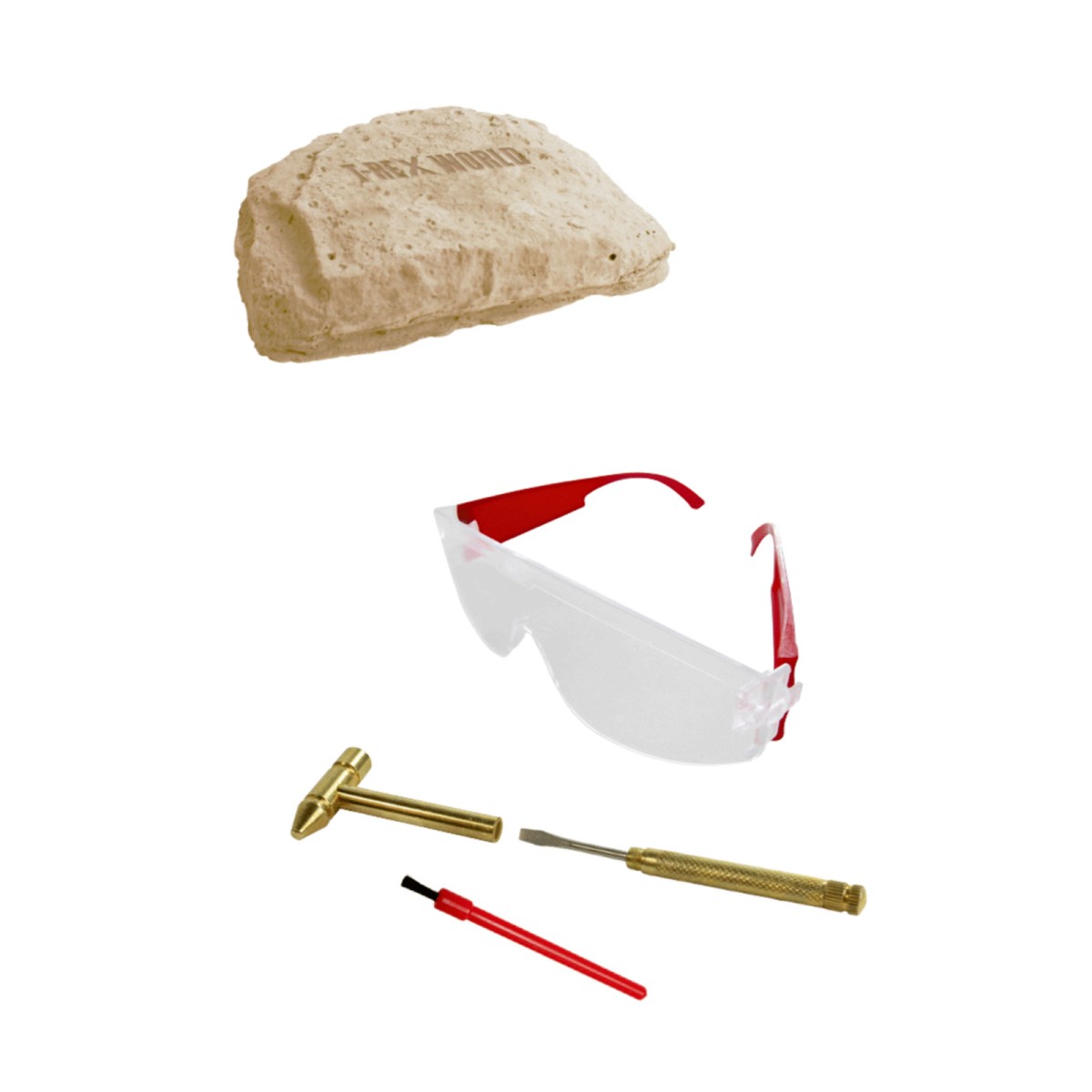 Forscherbrille, Metall-Hammer, Metall-Spatel, Pinsel, 11-teiligem Skelett im Felsblock, Anleitung