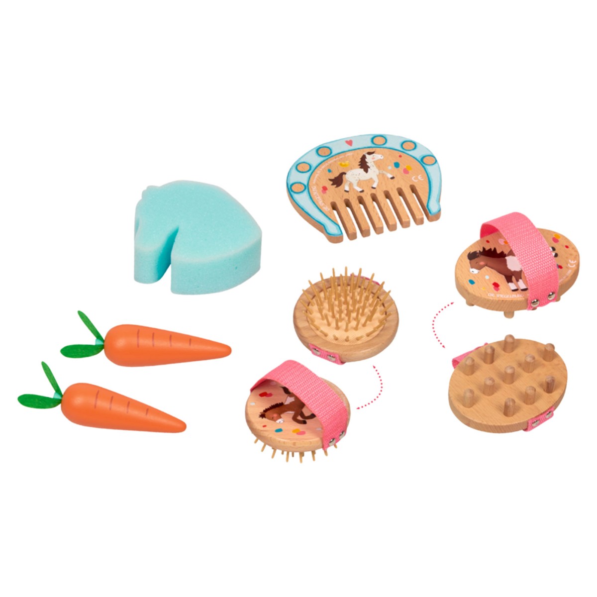 1 Kamm, 1 Striegel, 1 Bürste, 1 Hufkratzer, 1 Schwamm, 2 Möhren, 1 Köfferchen