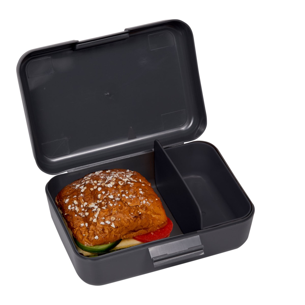 Damit bist du der Hingucker in der Frühstückspause! Die Butterbrotdose im schlichten schwarz und coolem Dino-Print hat eine stufenlos verstellbare Trennwand, sodass Butterbrot und Apfel sauber voneinander getrennt bleiben.