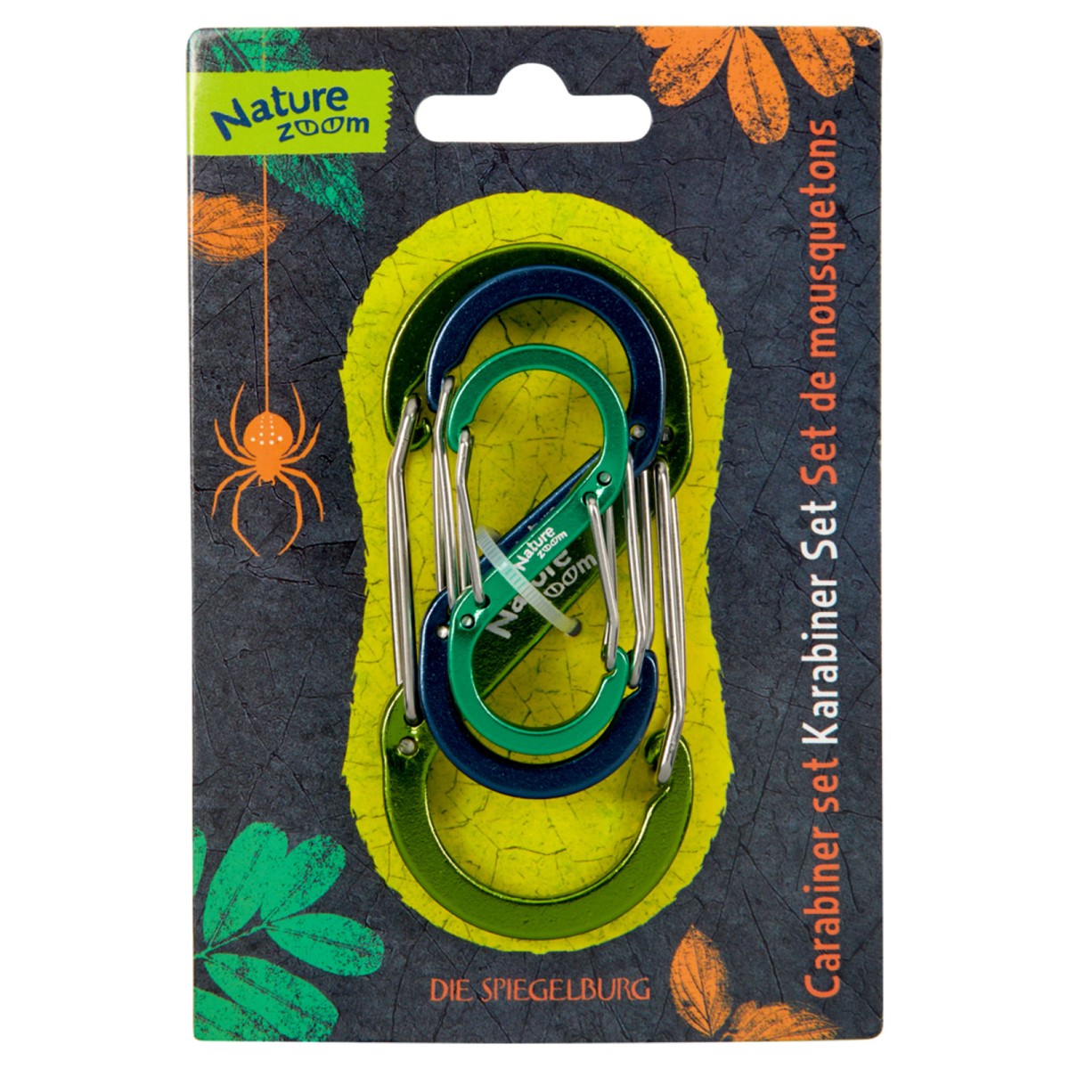 Das S-Karabiner Set – Nature Zoom von Die Spiegelburg enthält drei Karabinerhaken in unterschiedlichen Größen – ideal zum Befestigen von Ausrüstung, Flaschen oder kleinen Gegenständen.