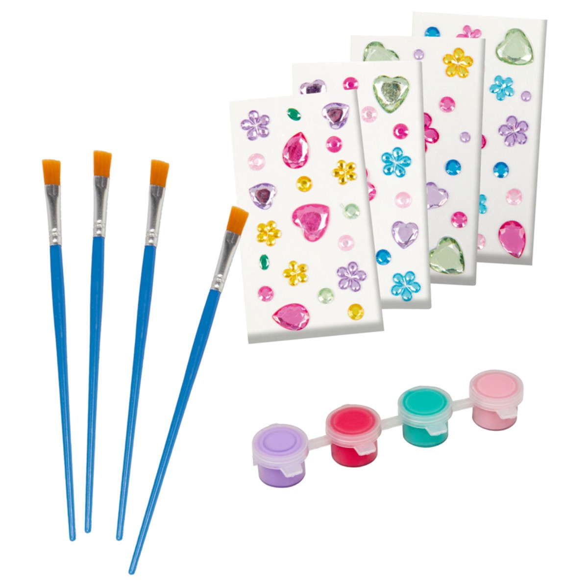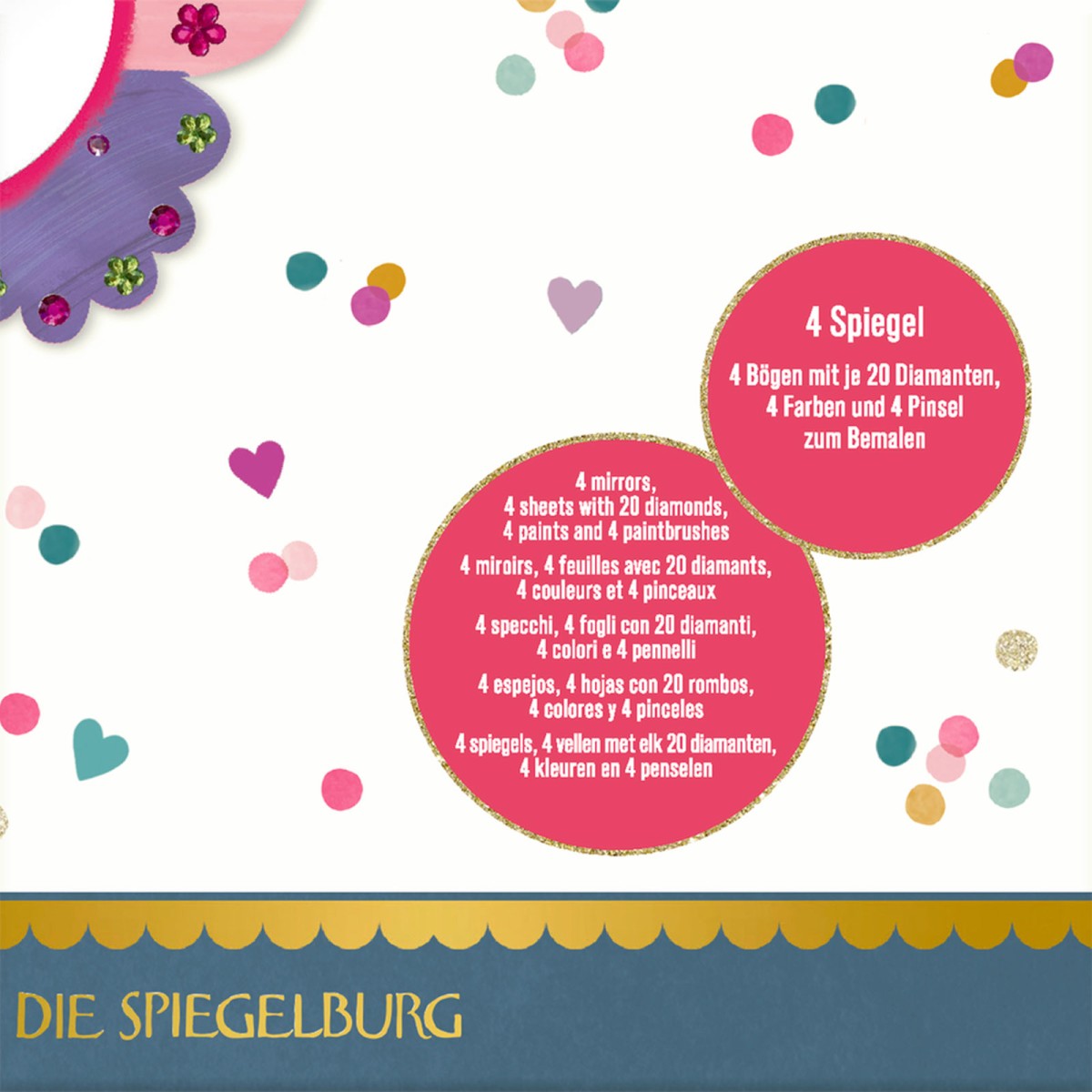 4 Handspiegel, 4 bunten Acrylmalfarben, 4 Pinsel, 4 Bögen Glitzersteine