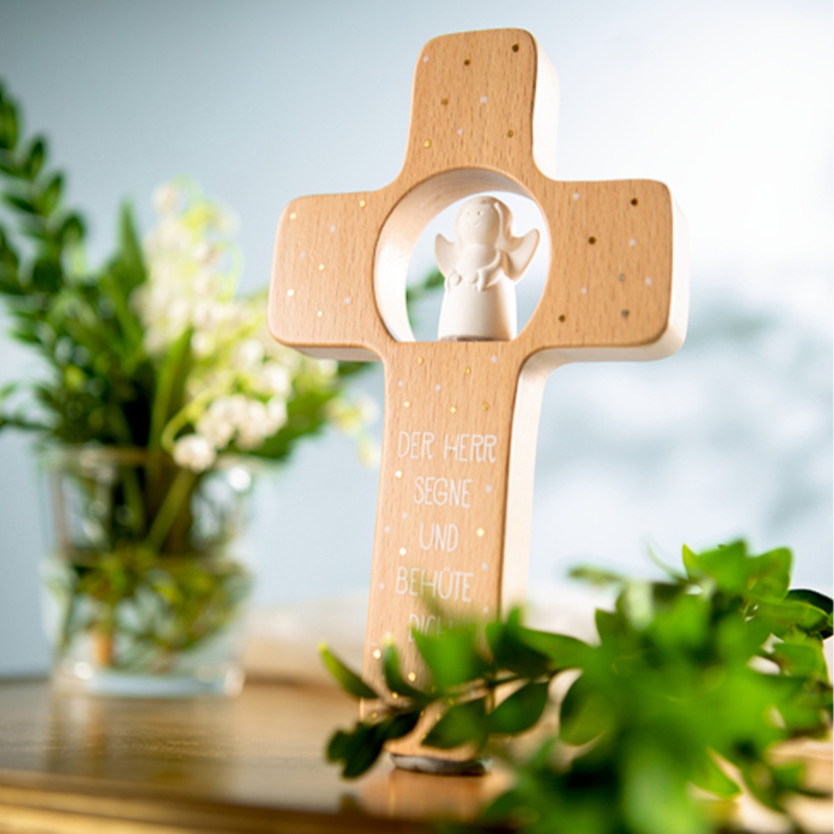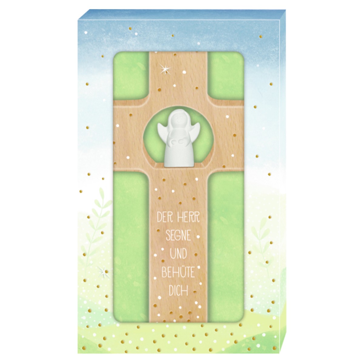 Auf dem bedruckten Holz ist der Spruch "Der Herr segne und behüte dich" zu lesen. Außerdem ist der Geschenkkarton mit Goldfolie verziert und optisch ein absoluter Hingucker.