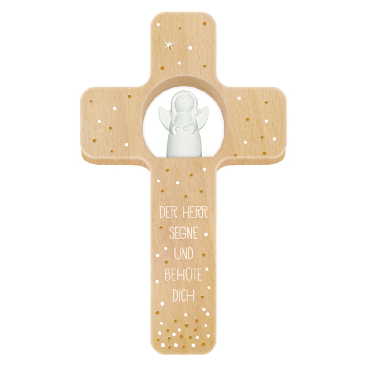 Holzkreuz mit Lochstanze und Engelfigur