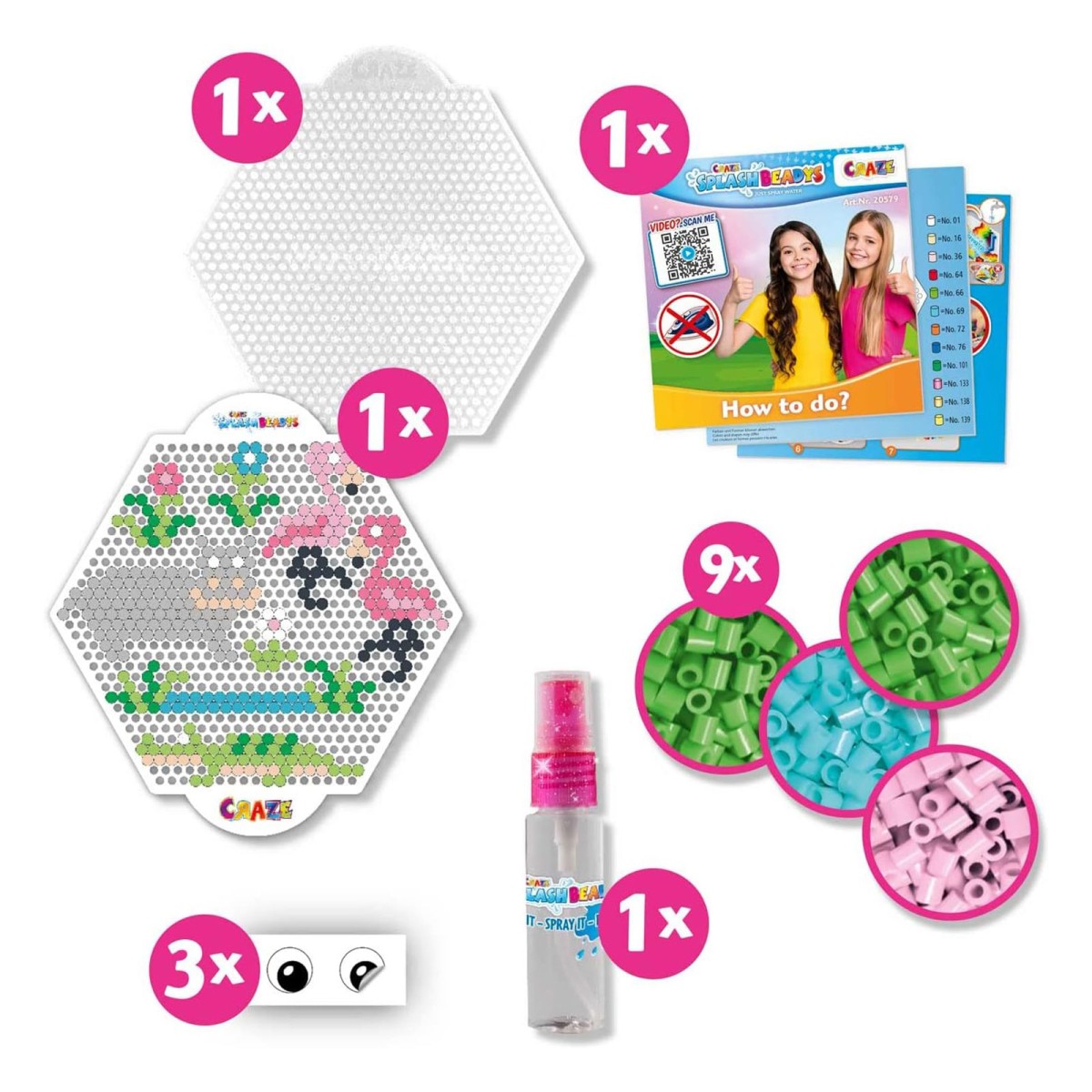 1 Splash Beadys Board, 1 Schablone, Splash Beadys, 1 Wassersprüher, Anleitung