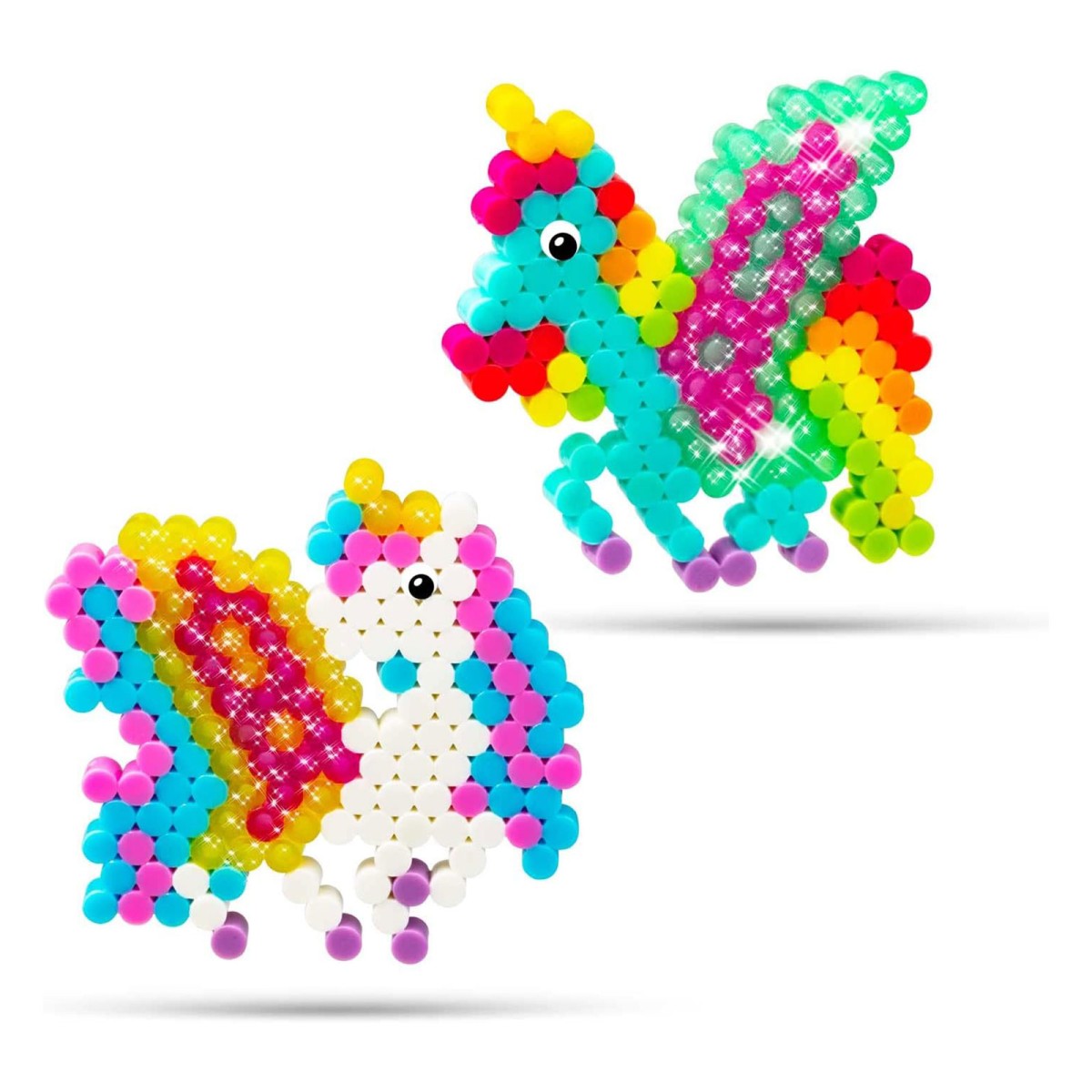 Die Splash Beadys funktionieren ganz ohne Hitze. Dafür einfach die Perlen von innen nach außen auf der Schablone zum Lieblingsmotiv stecken, mit Wasser besprühen, trocknen lassen und fertig!