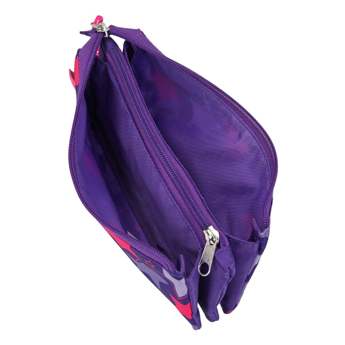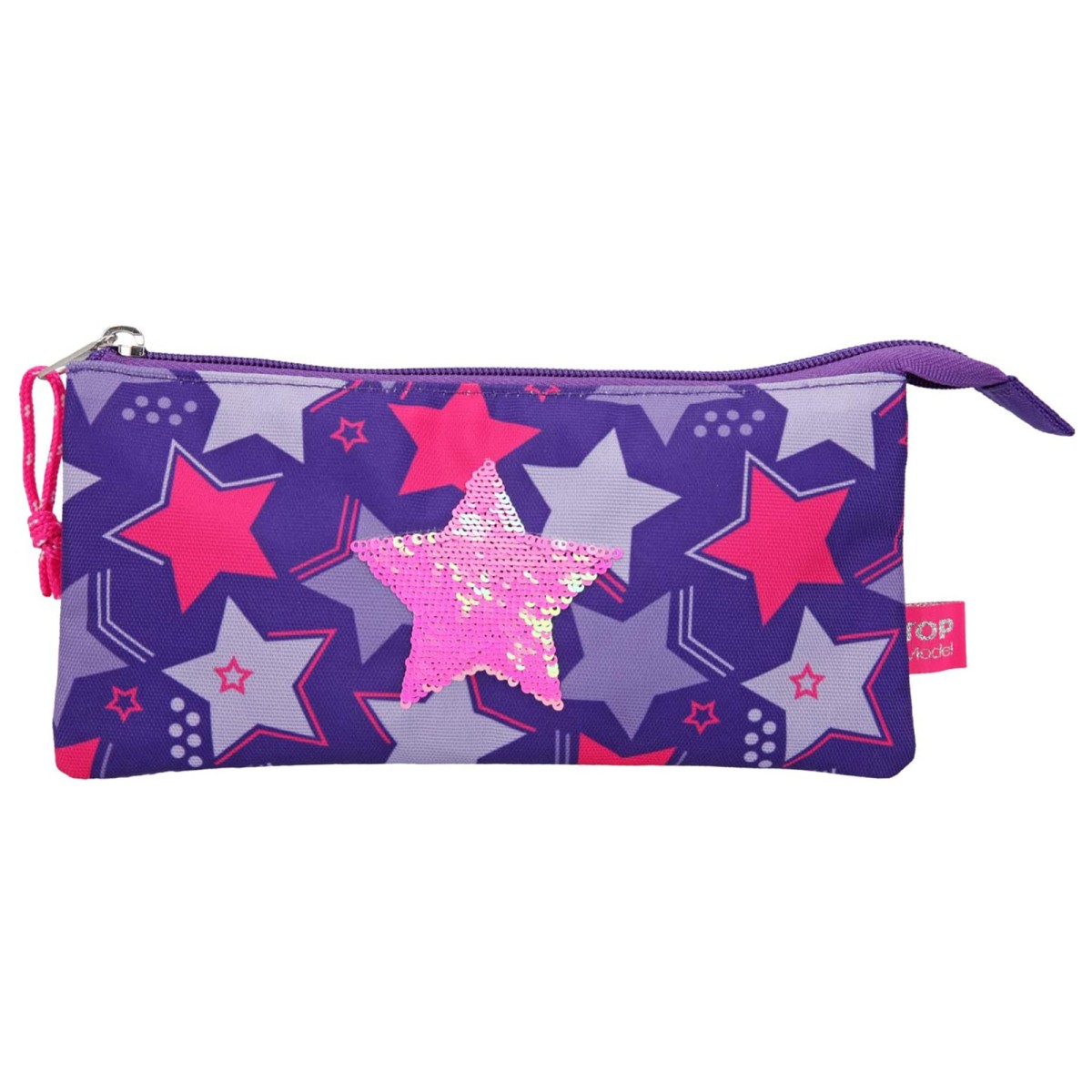 Das hübsche TOP Model Design ist mit einem Stern aus Streichpailletten verziert. Das lila Cover der Federtasche, die alternativ auch als Kosmetiktasche genutzt werden kann, sorgt ebenfalls für Hingucker.
