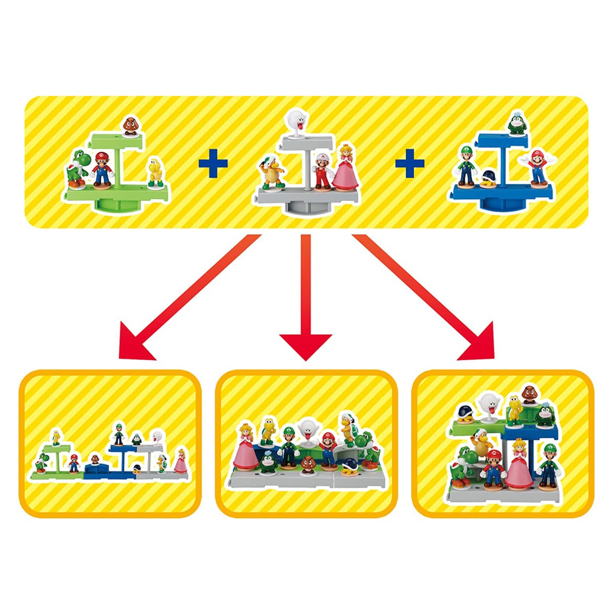 Anhand der Anweisungen auf dem Würfel platziert man die Figuren auf den Plattformen. Dabei muss die Stage immer in Balance sein, sonst fallen die Figuren herunter. In diesem Spiel sind 4 Super Mario Figuren und ein Würfel enthalten, die auch in allen anderen EPOCH Super Mario Gesellschaftspielen, die mit dem Zusatz "Link System" gekennzeichnet sind, verwendet werden können.