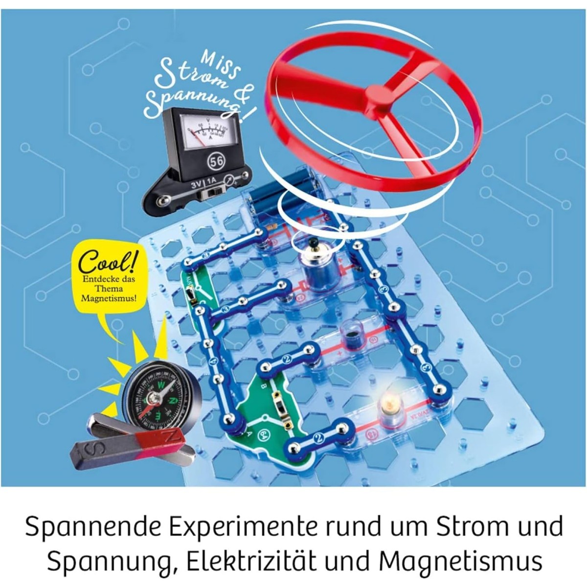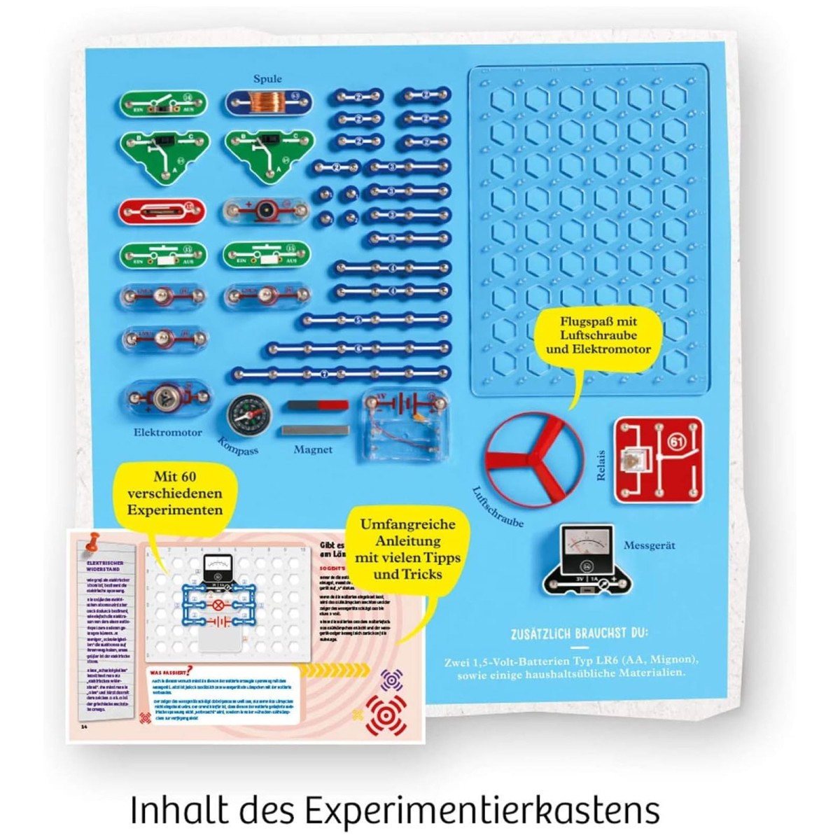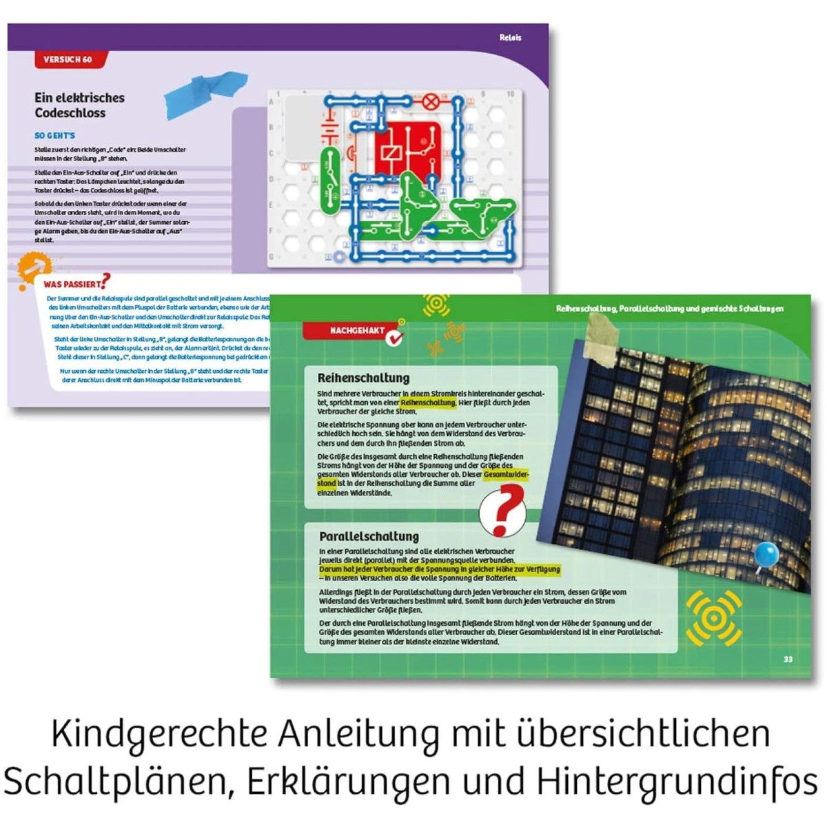 Mit dem kindgerechten Easy-Klick-System und genauen Bauplänen führen die Nachwuchs-Forscher die Versuche selbst durch: Sie nehmen erste Messungen vor, experimentieren mit einem Elektromotor, bauen Alarmanlagen mit Relais und erfahren Schritt für Schritt, was mit Elektrizität alles möglich ist. Die Anleitung vermittelt anschaulich, wie die Schaltungen aufgebaut werden und wie sie in einfachen Alltagsgegenständen wie Türklingeln und komplexen Geräten wie Kernspintomographen Anwendung finden.