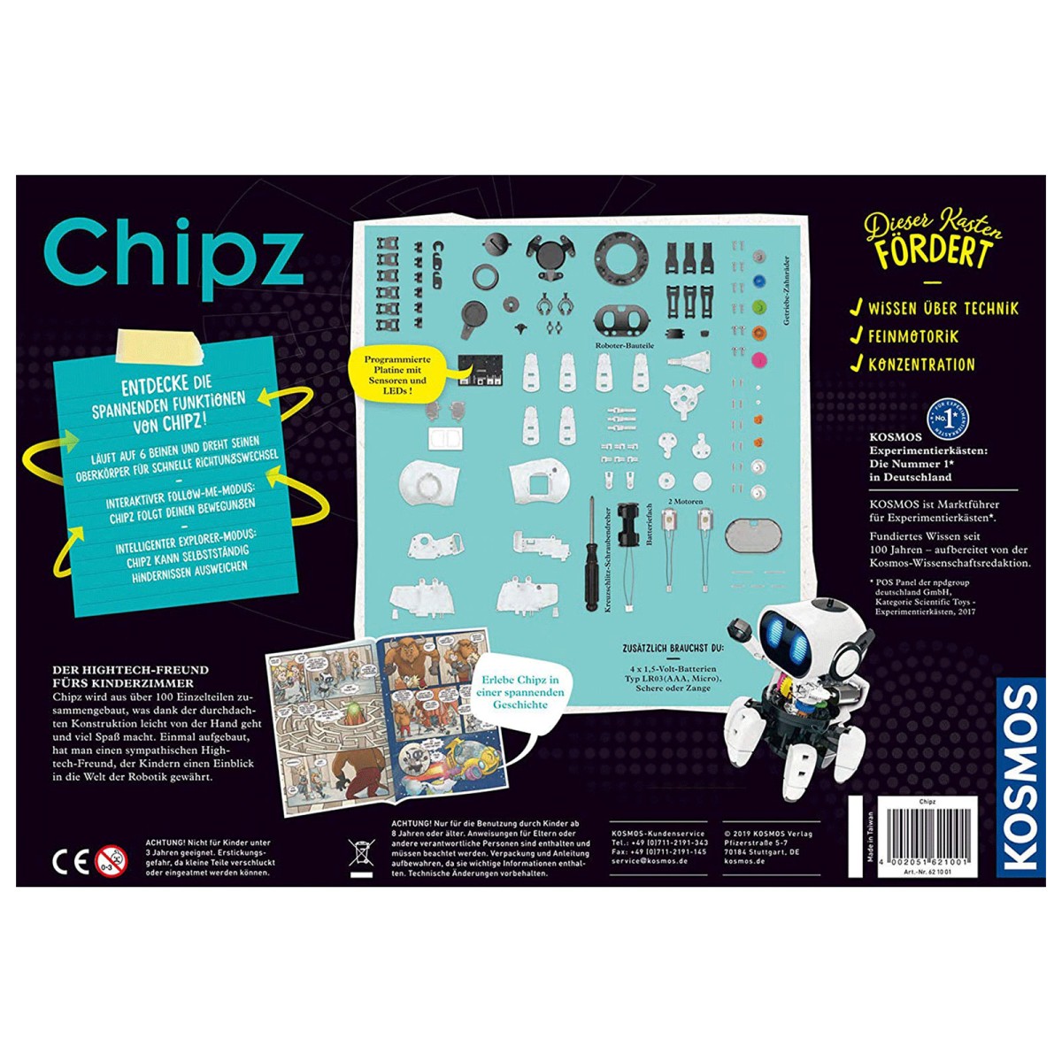 Ausgestattet mit sechs Beinen, Sound- und Lichteffekten ist der sympathische Kerl ein tolles Elektro-Spielzeug. Schon während des Zusammenbaus der über 100 Teile sorgt die durchdachte Konstruktion für viel Spaß. Eine Comic-Geschichte in der Anleitung lässt Chipz lebendig werden und die spannenden Hintergrundinfos vermitteln erste Einblicke in die Welt der Robotik und Physik.