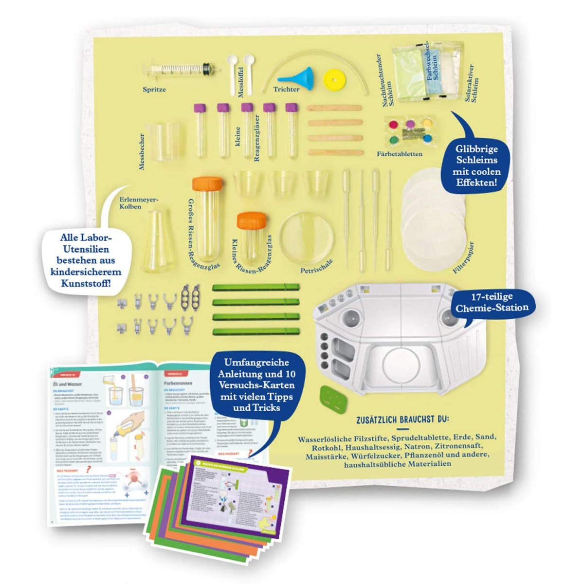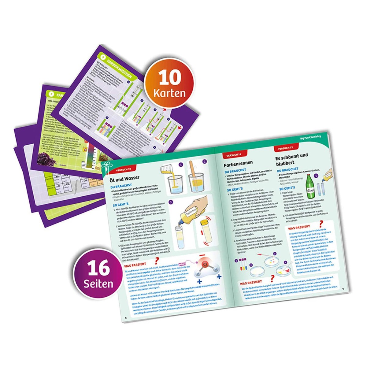Die bebilderte Anleitung enthält sowohl eine einfache, kindgerechte Aufbauanleitung für die Station und Schritt-für-Schritt-Versuchsbeschreibungen mit vielen Illustrationen für die Experimente, als auch spannendes Zusatzwissen mit Alltagsbezug zu jedem Versuch und zu den Grundlagen der Chemie.