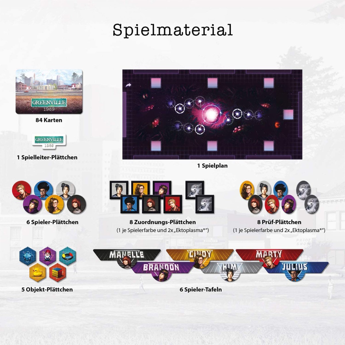 84 Karten, 1 Spielplan, 1 Spieleiter-Plättchen, 6 Spieler-Tafeln, 6 Spieler-Plättchen, 8 Zuordnungs-Plättchen, 8 Prüf-Plättchen, 5 Objekt-Plättchen, Spielanleitung