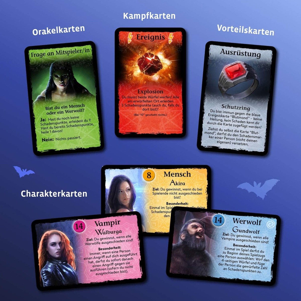 - Spannendes Spiel mit drei geheimen Gruppen: Vampir, Werwolf und Mensch