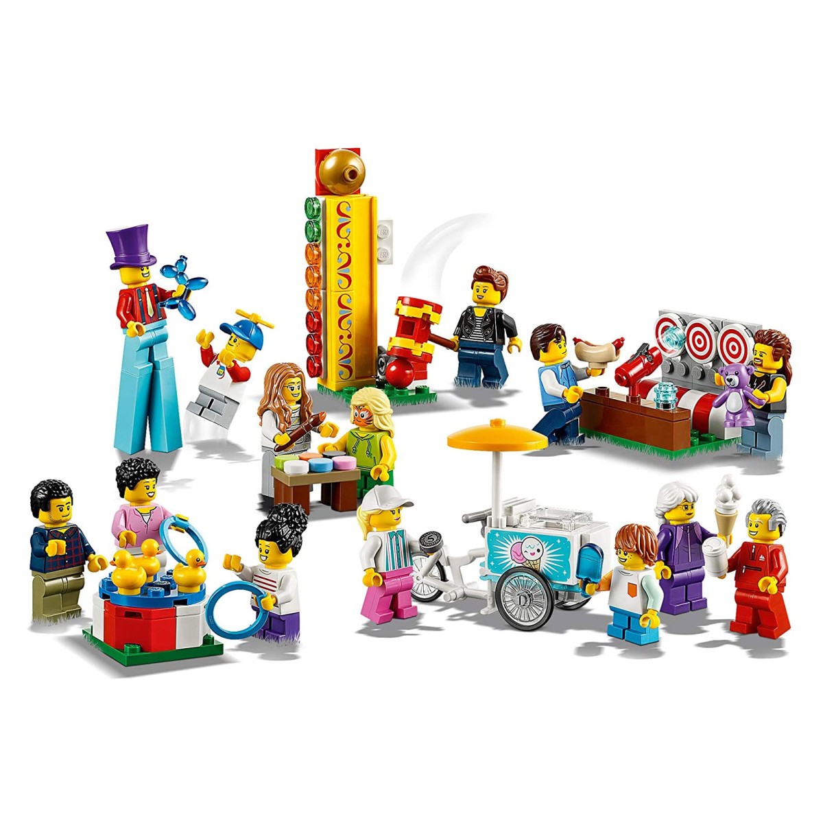 Mit diesem coolen Jahrmarkt-Set werden die LEGO® City Rollenspielabenteuer noch aufregender. Das umfangreiche Spielset „Stadtbewohner – Jahrmarkt“ (60234) umfasst 14 neue Minifiguren für deine Stadt, ein Ringwurfspiel mit 3 Entenelemente (neu ab Juni 2019), ein Schießbudenspiel mit Noppen-Shooter, einen Schminktisch, einen Stärketest und ein Eiscreme-Fahrrad mit Schirm und Platz für eine Eistüte.