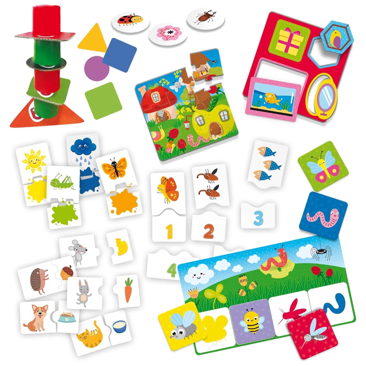 1 Puzzle (9 Teile), 8 Zylinder aus Kunststoff, 8 geometrische Formen, 1 Spielplan, 8 Suchen-und-Finden-Plättchen, 1 Formen-Puzzle (4 Teile), 6 Farben-Karten, 5 Zahlen-Karten, 5 Groß-und-Klein-Karten, 16 Memoplättchen, 2 Schatten-Tafeln