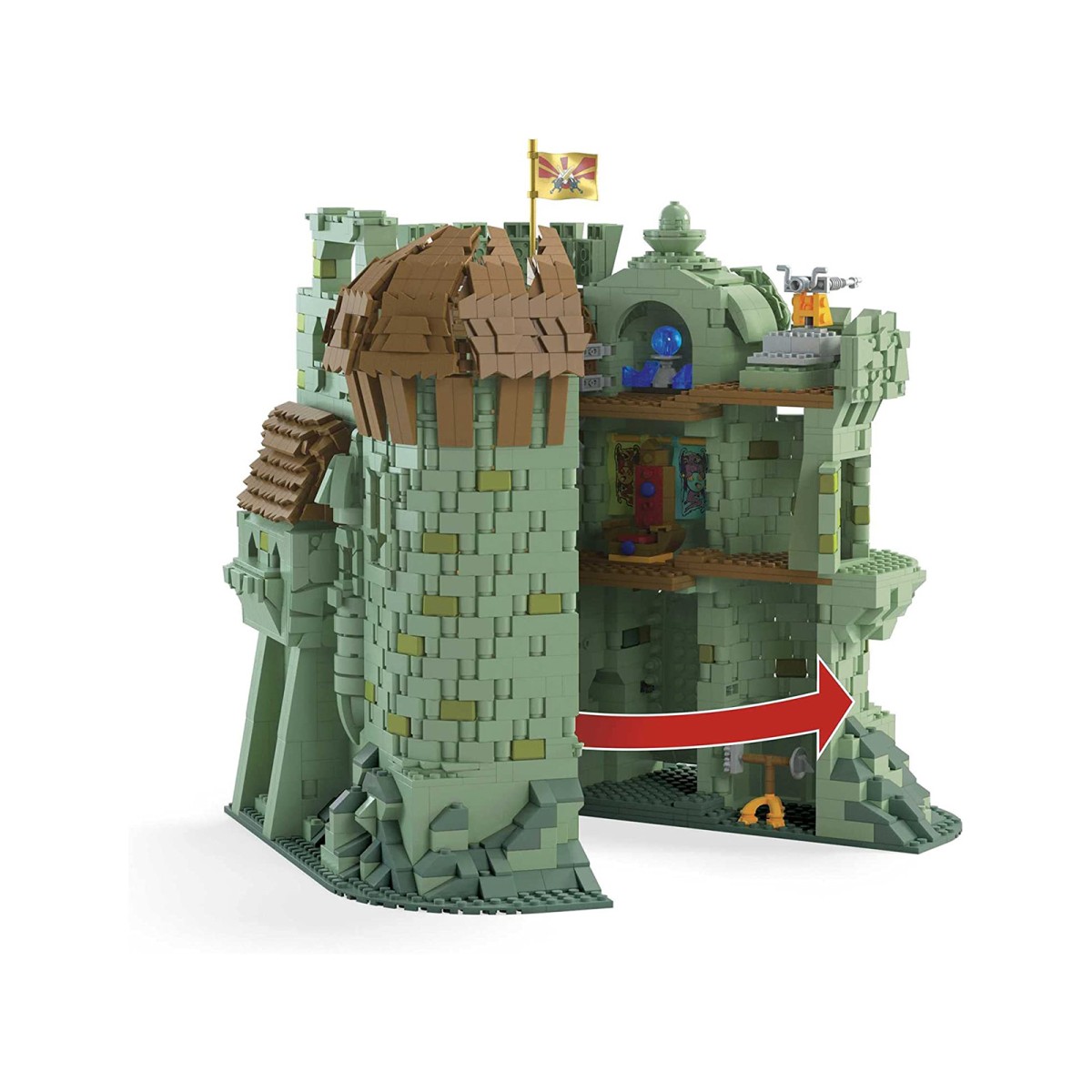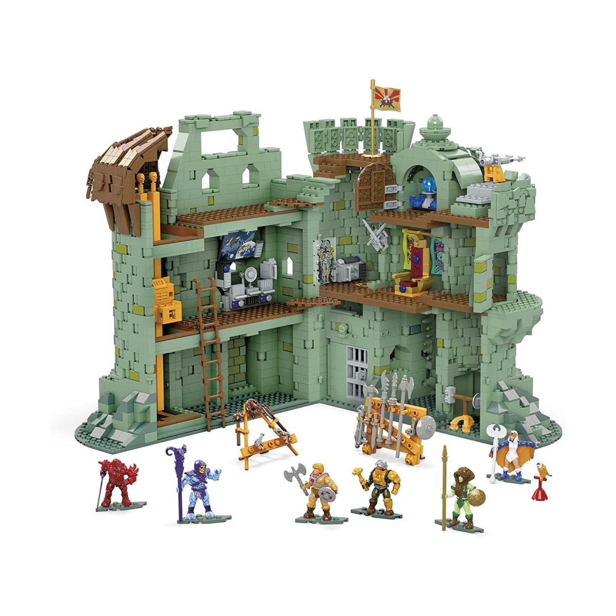 3 Etagen, 6 Figuren, viele tolle Details und 1 großes Gefecht. Nur He-Mans Schwert der Kraft kann das mächtige Burgtor öffnen. Ein funktionierender Aufzug sorgt für ein geschicktes Wechseln zwischen Etagen. Den Thron verschieben, um die Falltür zu öffnen, die ins darunter gelegene Verlies führt.