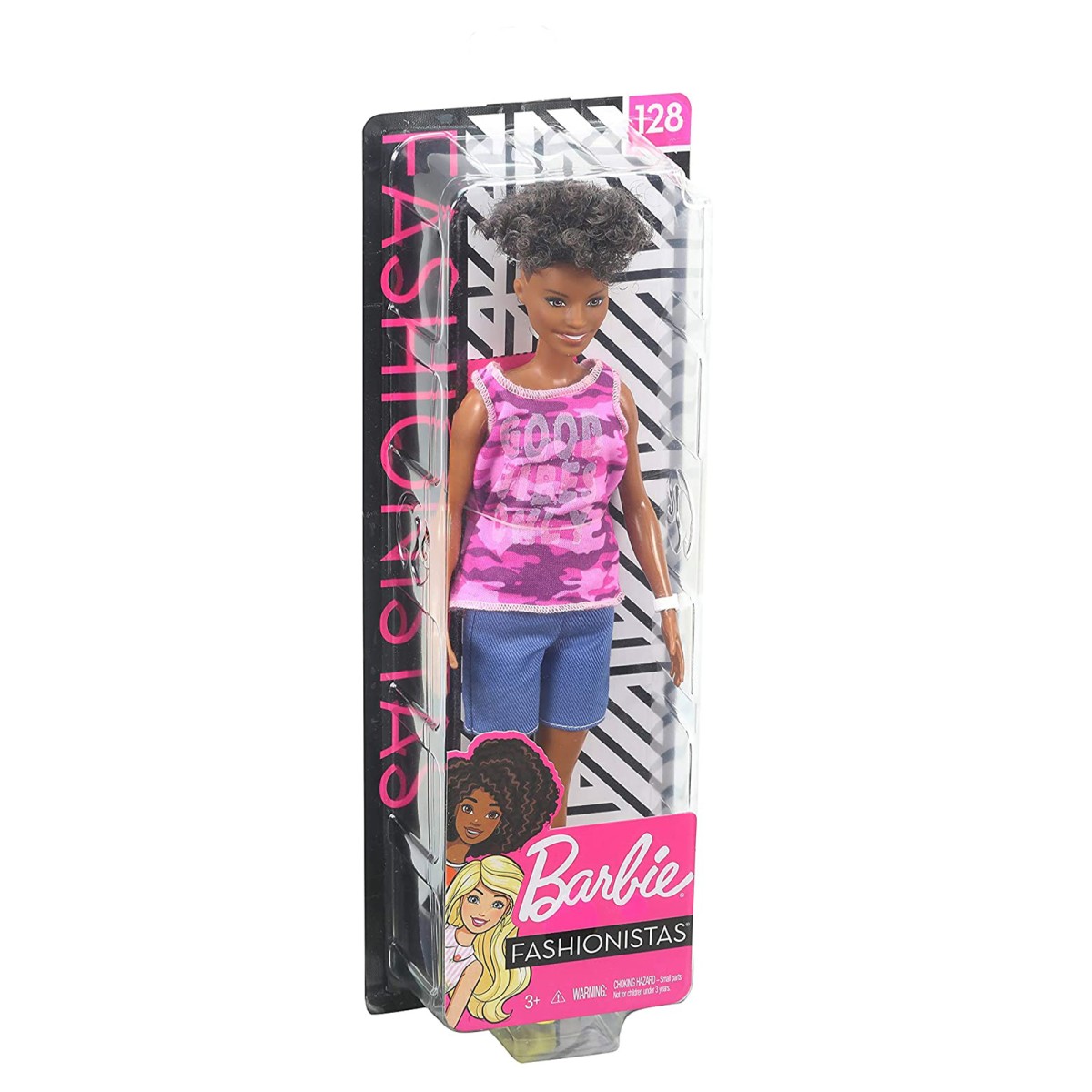 - Die Barbie-Puppe hat weniger Oberweite als die klassische Barbie und trägt ein pinkfarbenes Camouflage-Oberteil