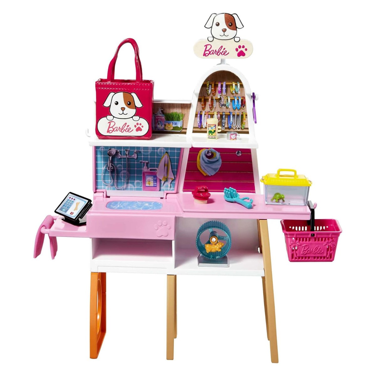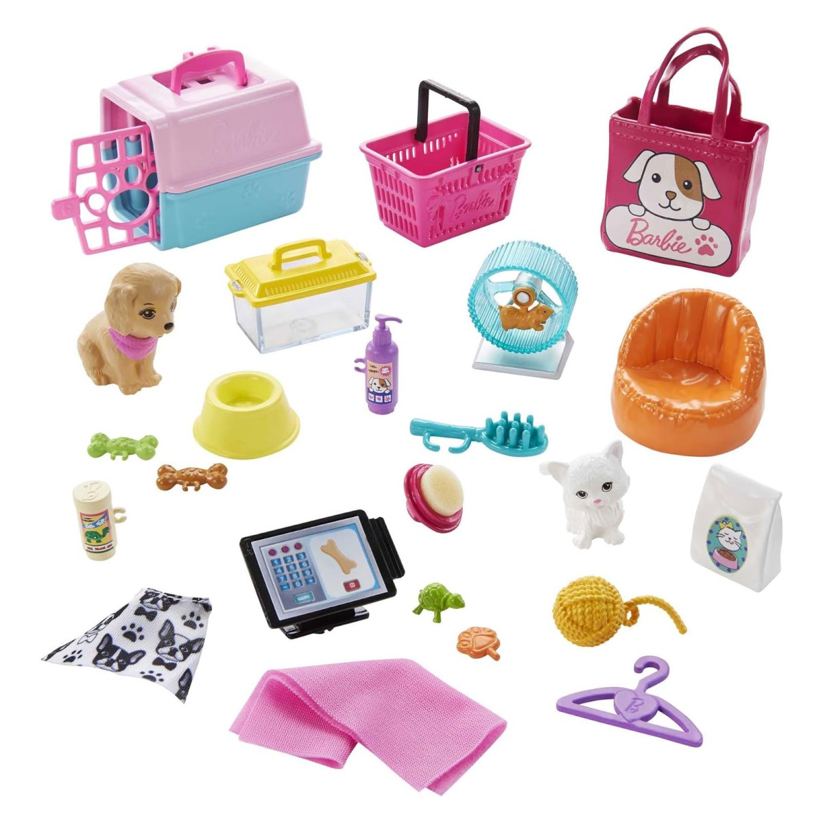 Dieses Spielset regt zu fürsorglichen Rollenspielen und Freundschaftsgeschichten an. Enthalten sind eine Pflegestation, eine Kasse, ein Regal und über 20 themenbezogene Spielteile. Um Barbie bei der Pflege ihres Hündchens zu helfen, einfach den Tisch hochklappen und zum Vorschein kommt eine Pflegestation.