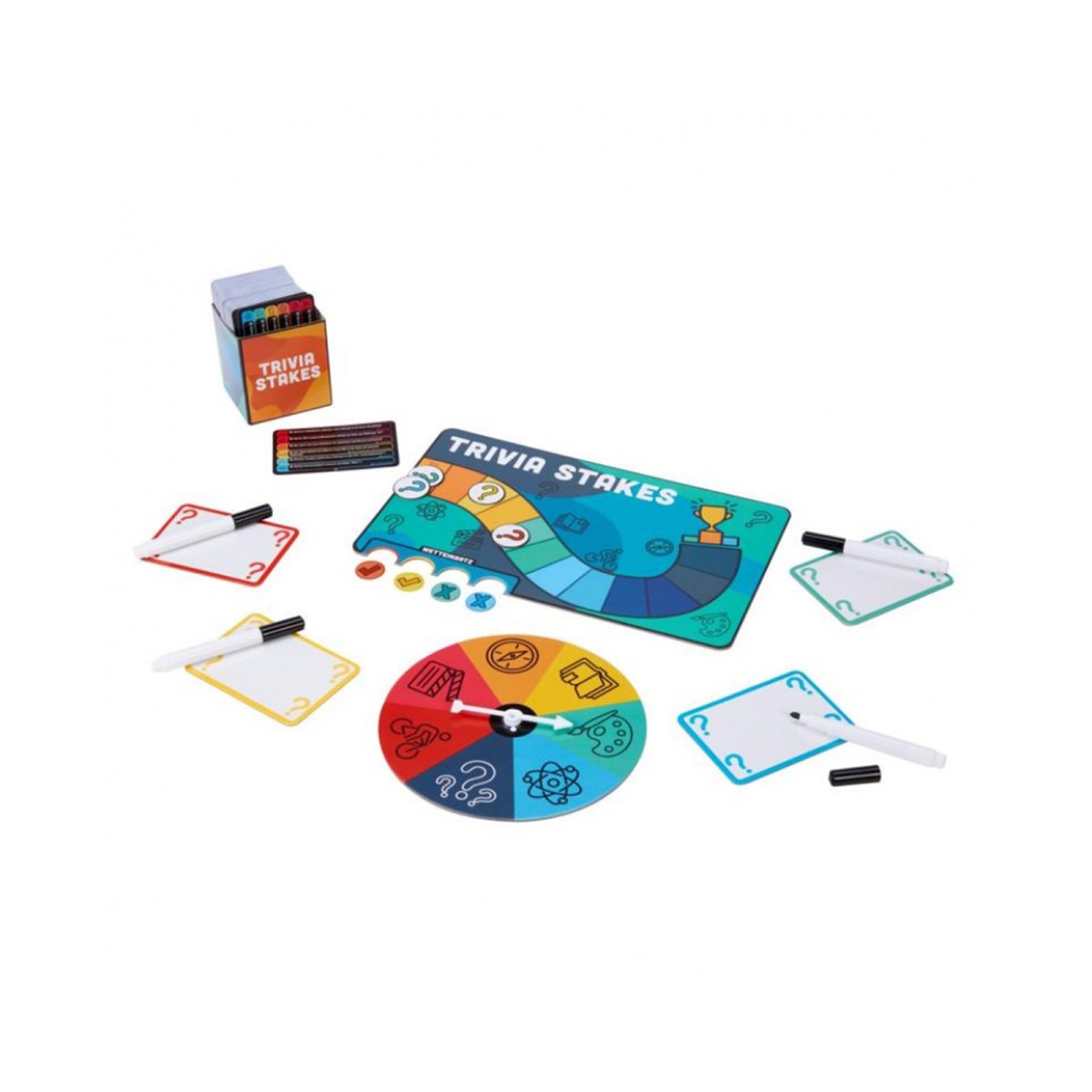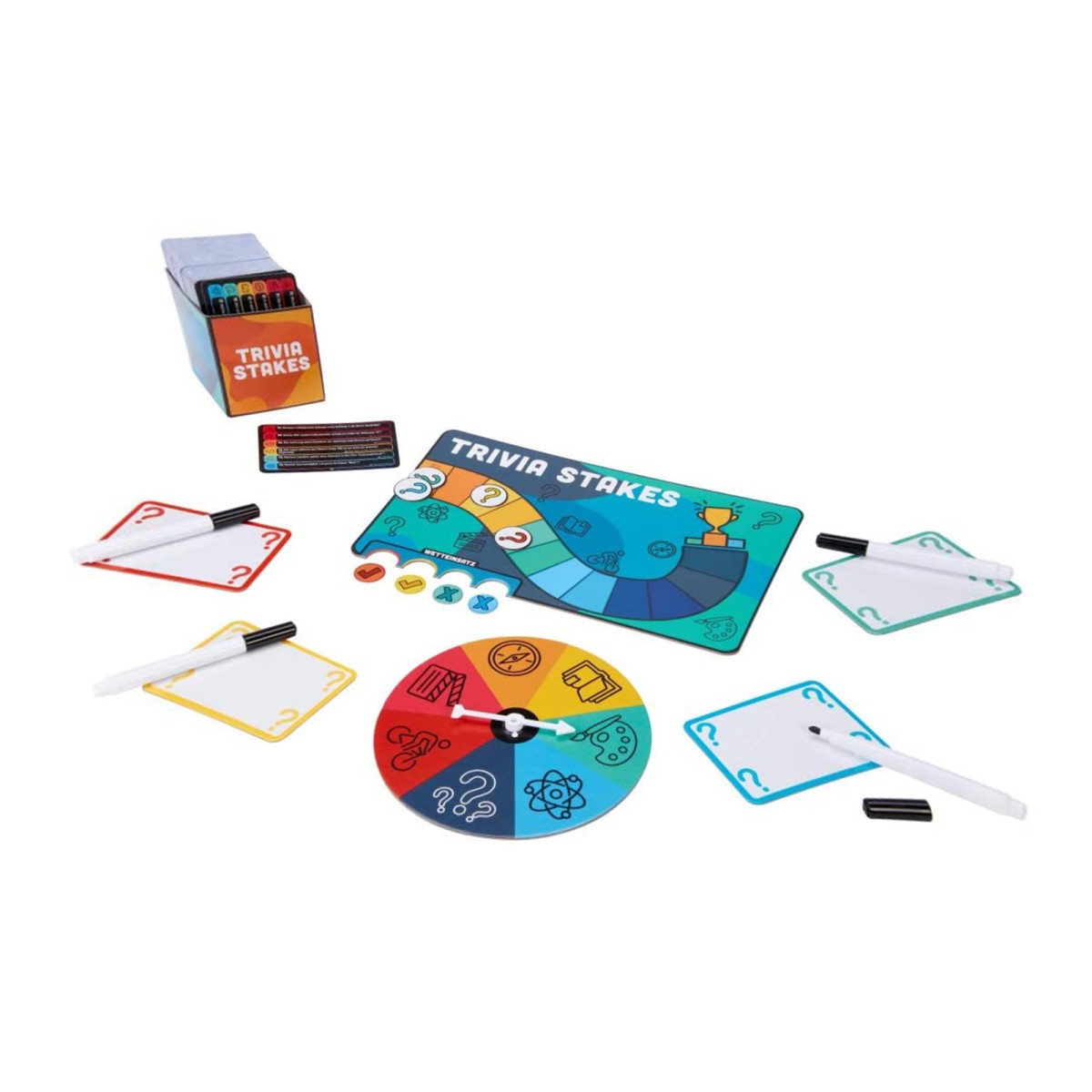Mit dem tollen Quiz-Brettspiel „Trivia Stakes“ von Mattel können Spieler ihr Wissen unter Beweis stellen! Hier müssen nicht nur Fragen richtig beantwortet werden, sondern auch Einsatzmarken richtig gesetzt werden. Mit den Marken tippt man jede Runde, ob die anderen Spieler wohl die richtige Antwort aufgeschrieben haben oder nicht.