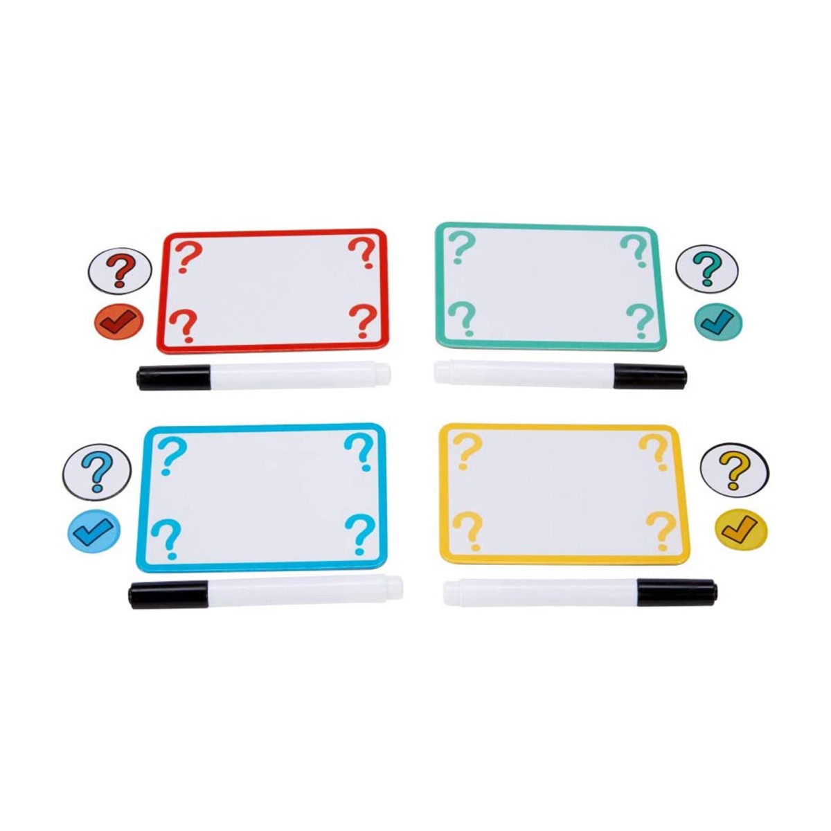 1 Spielbrett, 1 Scheibe mit Drehpfeil, 4 Spielfiguren, 4 Wettplättchen, 4 abwischbare Stifte, 4 abwischbare Tabelaus, 168 Fragekarten