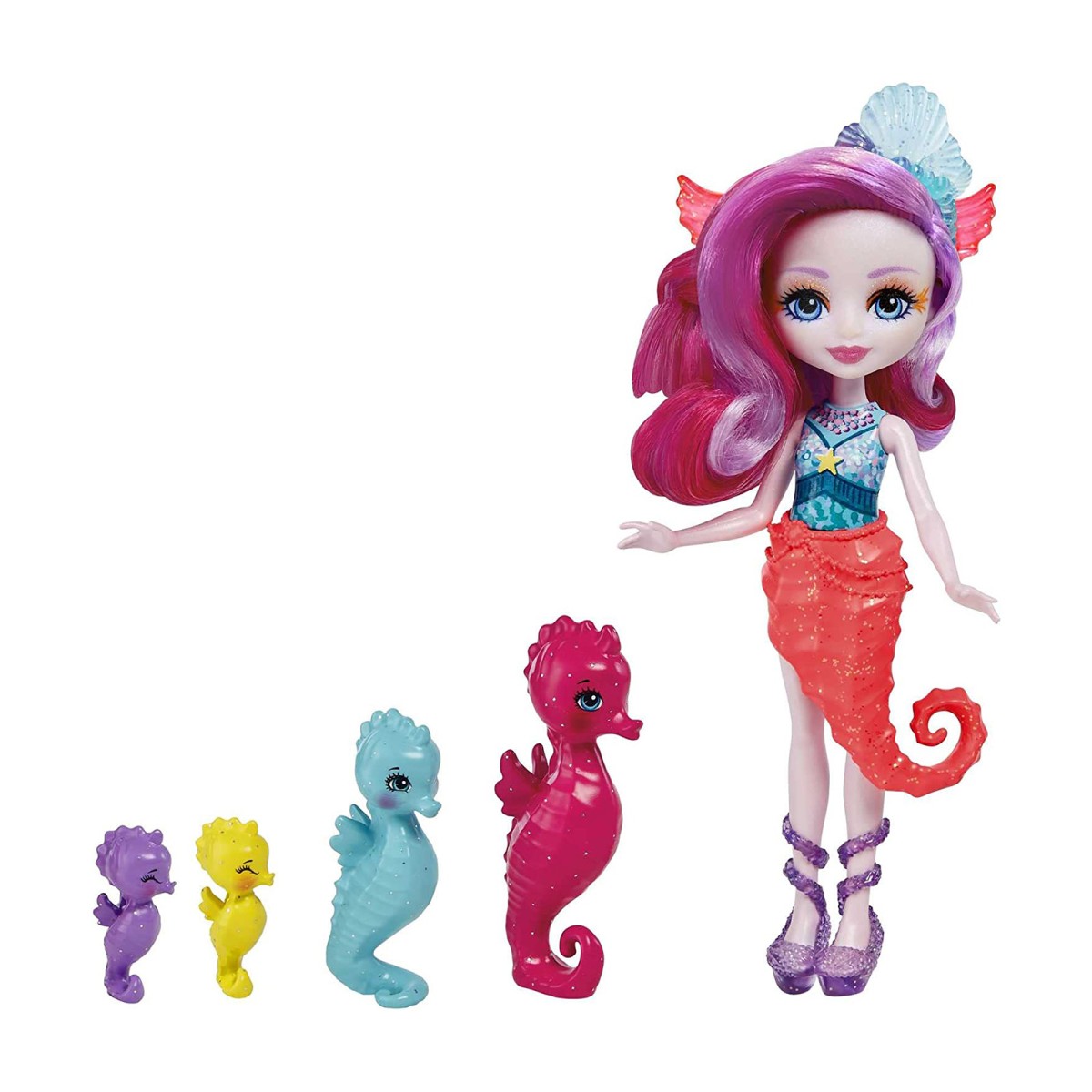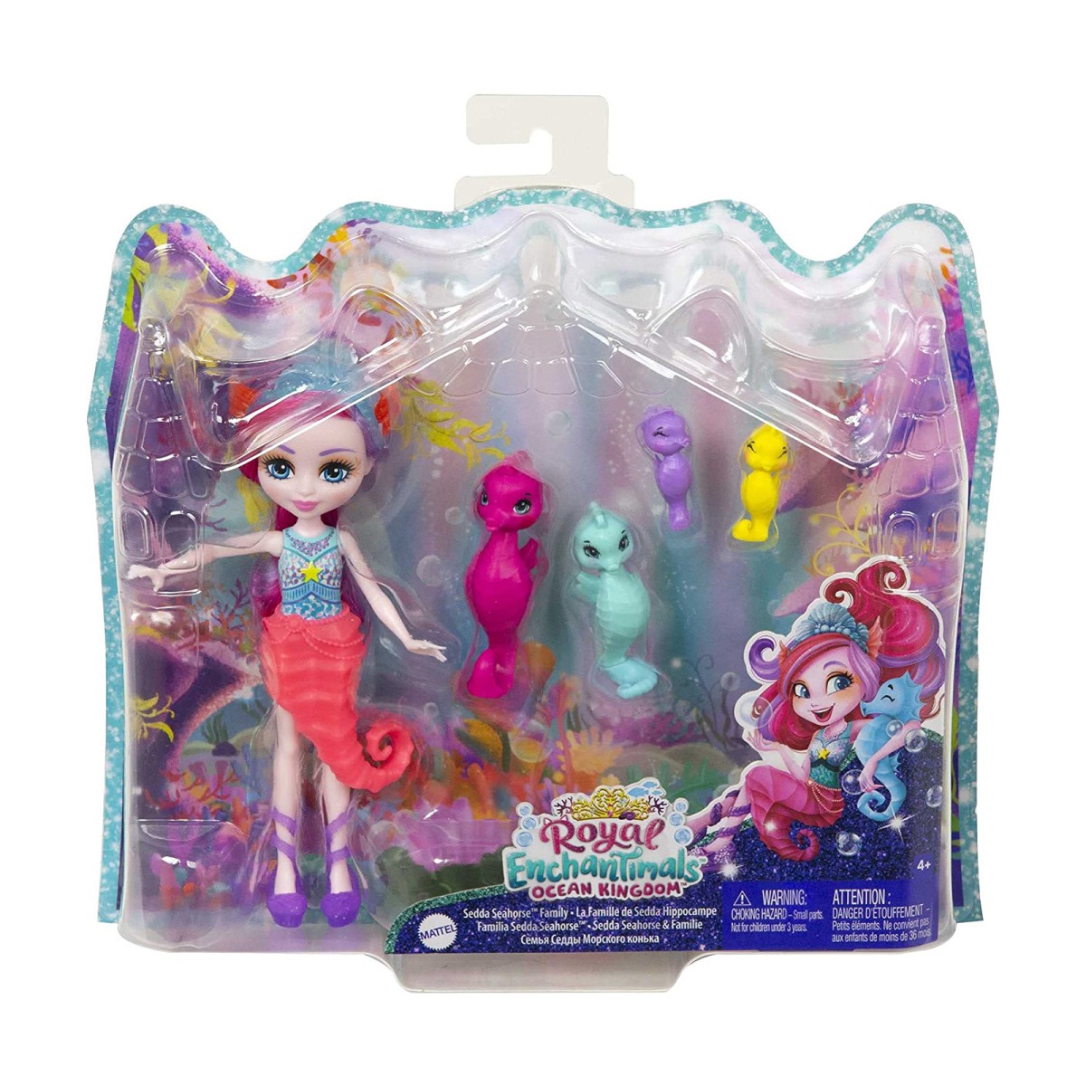 Dieses Enchantimals Familienset aus der Ocean Kingdom Kollektion enthält eine Sedda Seahorse Puppe (ca. 15 cm) und 4 Seepferdchen-Tierfreunde.