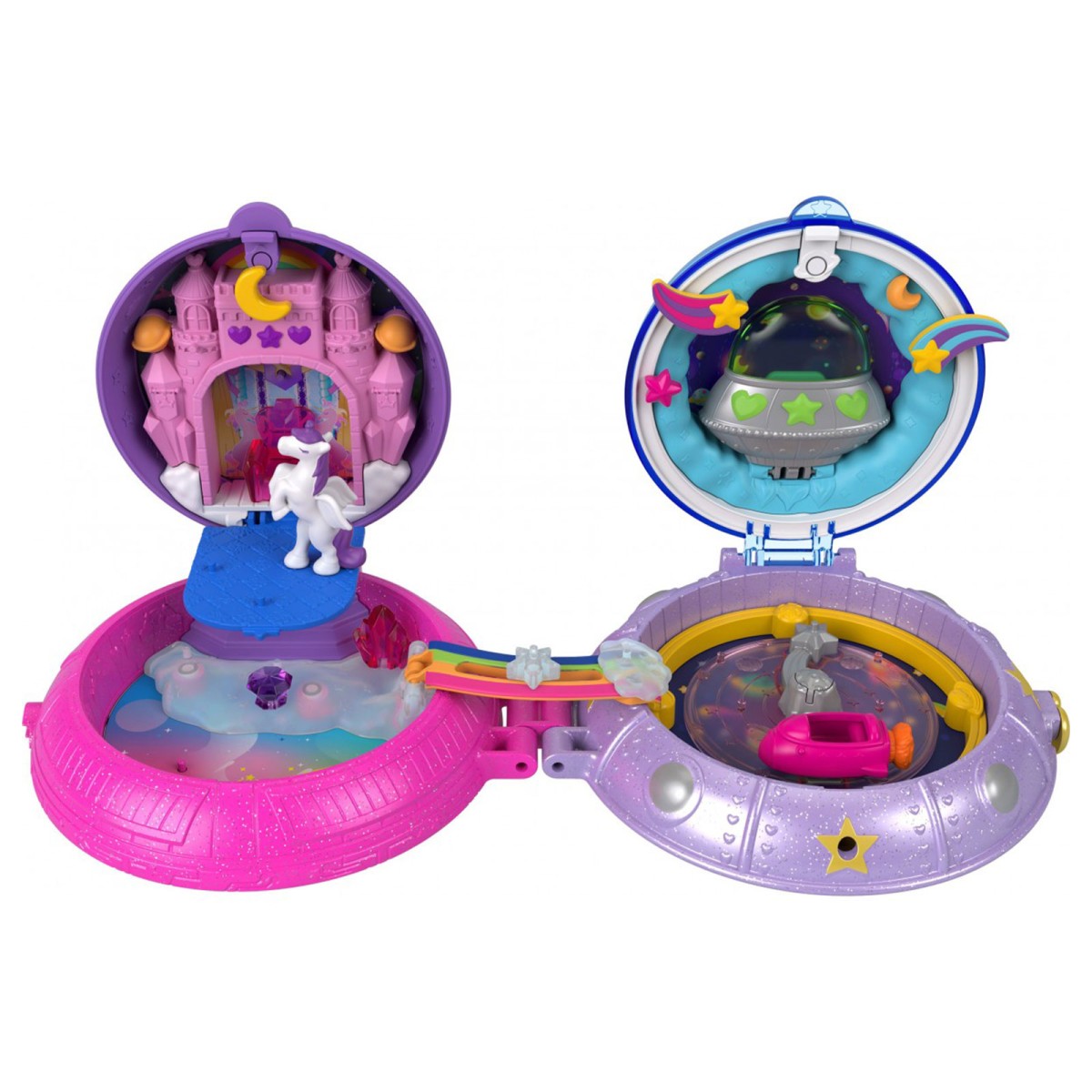 Die Schatulle enthält außerdem 2 kleine Puppen, 15 Zubehörteile und 1 Mode-Accessoire. Kinder können tolle, themenspezifische Aktivitäten entdecken und spielerisch ausleben: Schloss- und Raumschifftüren öffnen, auf dem Thron des Schlosses sitzen, im Raumschiff sitzen, die Konstellation drehen, in der Rakete fliegen, im Mondstuhl schaukeln, das Teleskop bewegen, den Regenbogen aufklappen, um zwei untere Teilbereiche miteinander zu verbinden (die Kinder können auch Teile oder Puppen auf dem Regenbogen platzieren und sie hin und her rutschen lassen) und mehr.