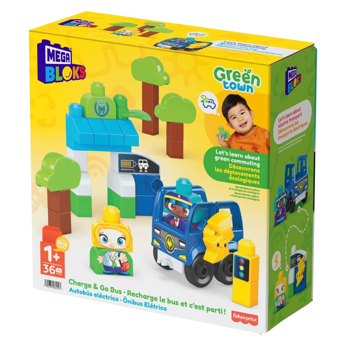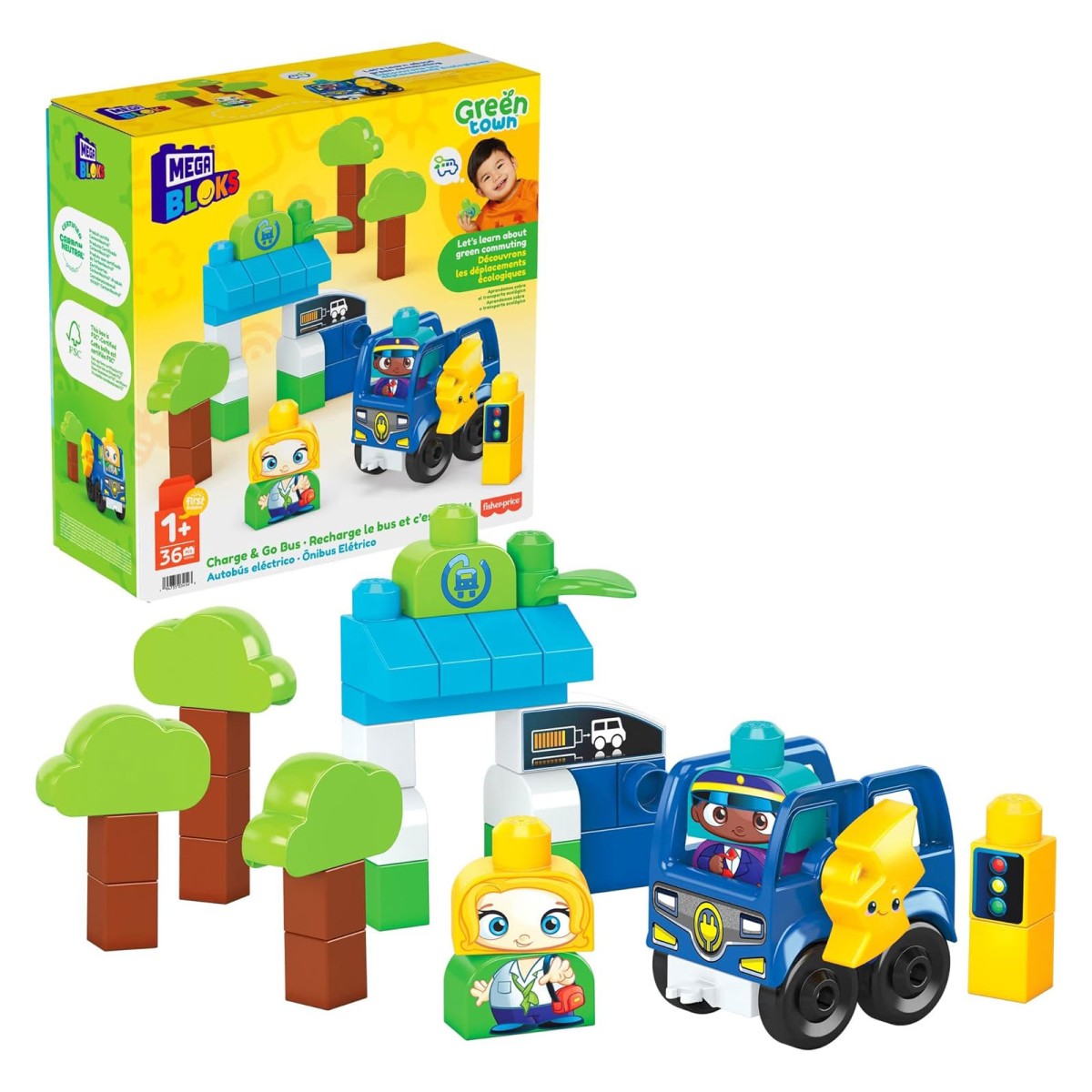 Dieses Bauset enthält 35 große Bausteine, darunter spezielle Teile, und 1 Untersatz mit Rädern. Damit lassen sich 1 rollender Elektrobus, 2 Figuren, 1 Bushaltestelle mit Ladestation und 3 Bäume zusammenbauen.