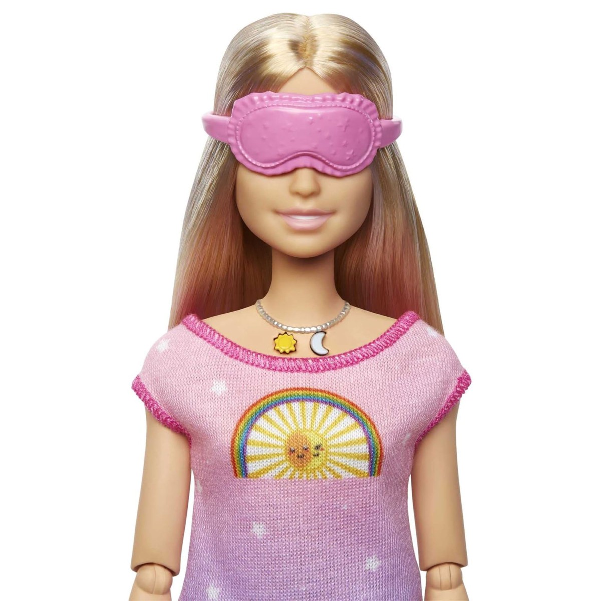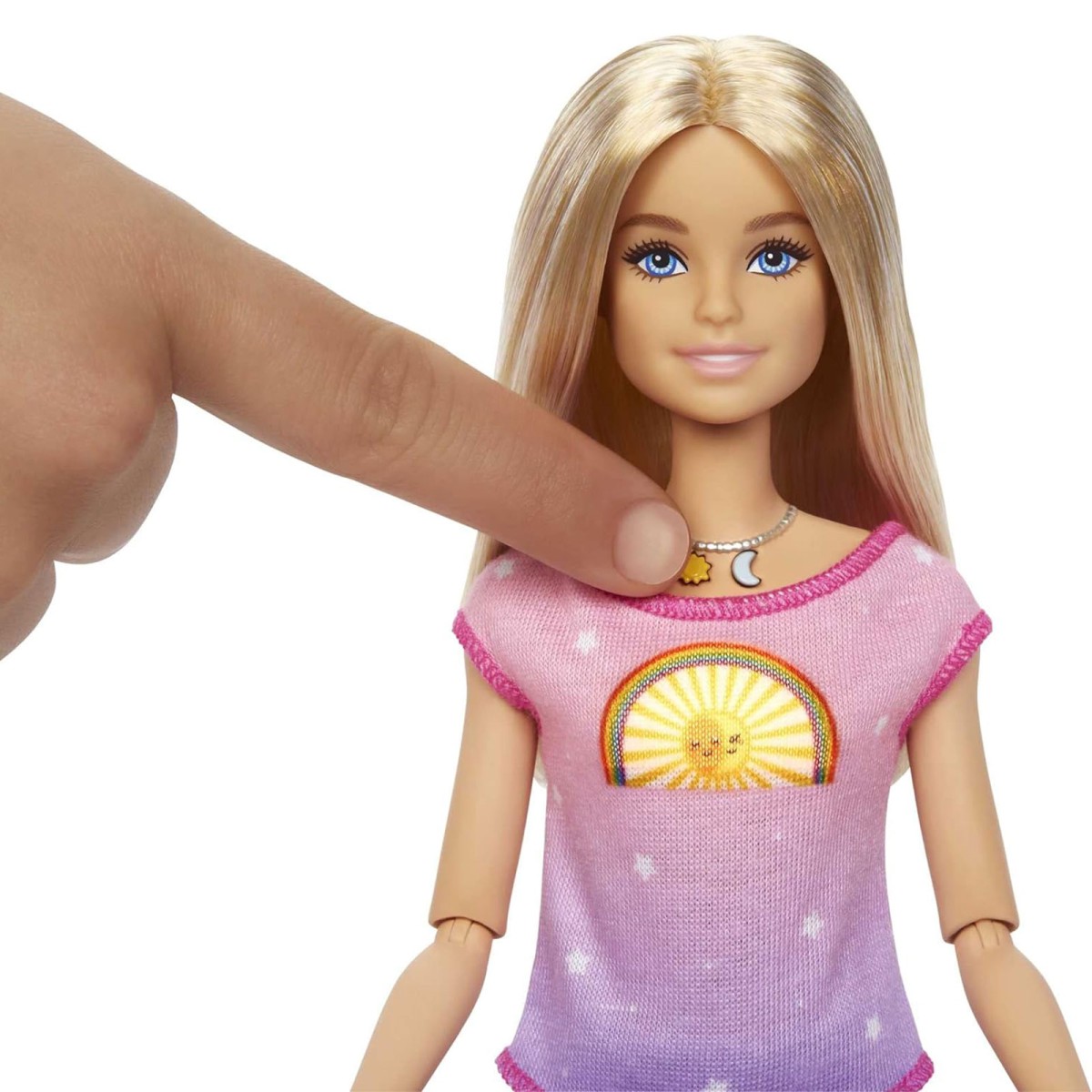 Durch Drücken der Sonne auf Barbies Halskette wird der Tagesmodus für Atemübungen aktiviert. Durch Drücken des Mondes auf der Halskette wird der Nachtmodus für Entspannung und Einschlafen aktiviert.