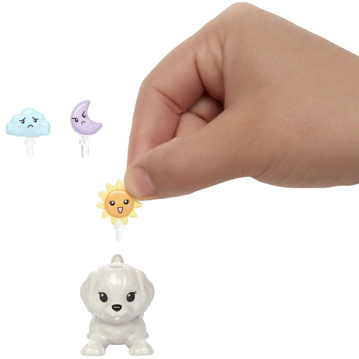 Neben der ca. 29 cm großen Puppe gibt es auch Zubehör wie eine Augenmaske, einen Welpen und drei verschiedene Emoticon-Anhänger, die Kinder an den Welpen anbringen können, um ihre Stimmung auszudrücken.