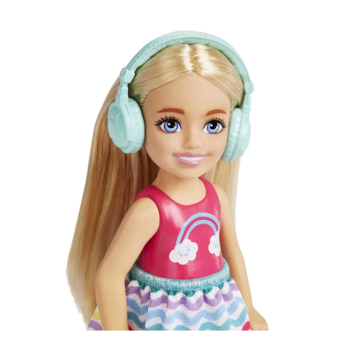 1 Chelsea-Puppe, 1 Hündchen, 1 Hundetragekorb, 1 Rucksack, 1 Tablet, 1 Teddybär, 1 Paar Kopfhörer, Sticker