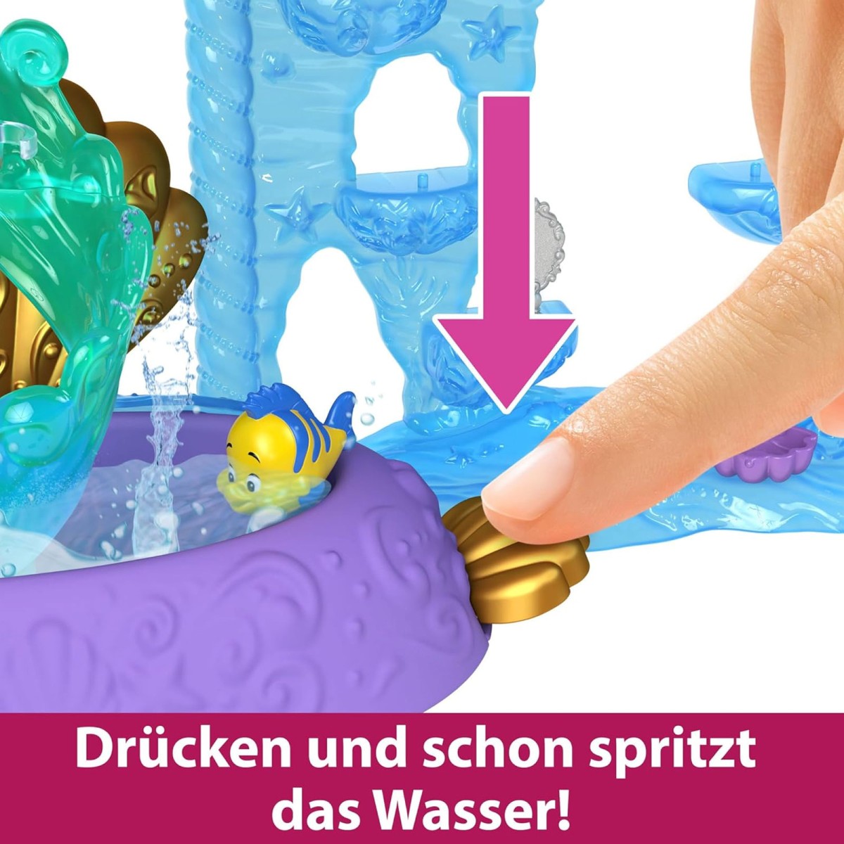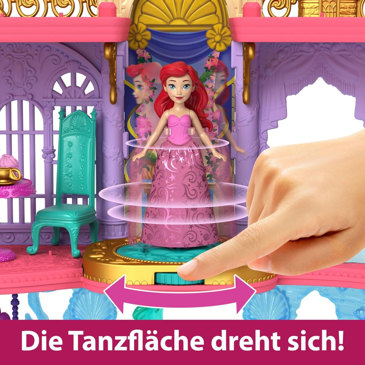 Das 31,1 cm hohe Spielset umfasst 6 ikonische Spielbereiche aus dem Film, darunter Arielles Schlafzimmer, ein Esszimmer, eine drehbare Tanzfläche für Landabenteuer und einen sprudelnden Pool für Unterwasserträume. Mit dabei sind außerdem eine niedliche Fabius-Figur, Möbel und zahlreiche Spielteile, die Szenen aus Arielles Geschichte lebendig machen.