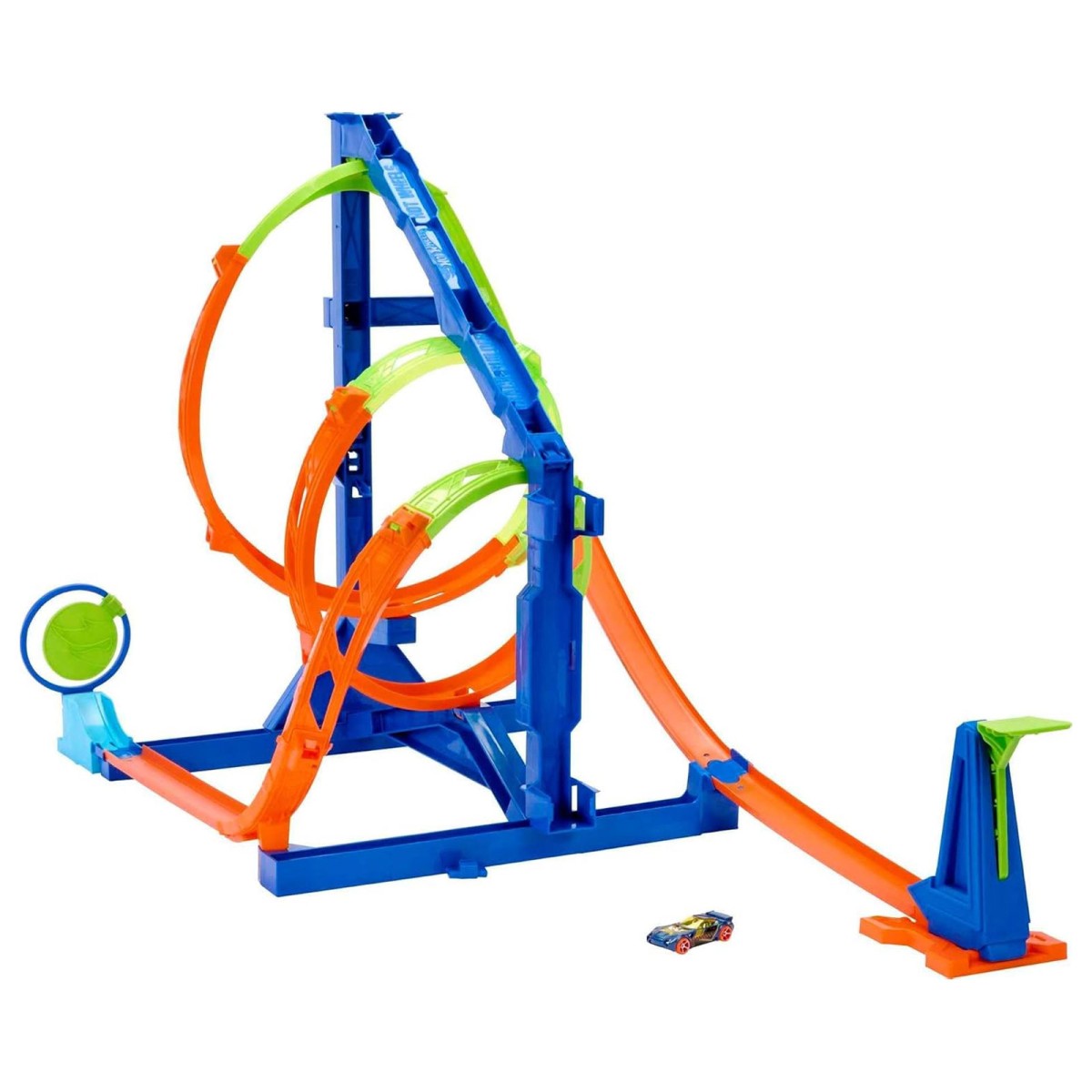 Mit dem Hot Wheels Action Looping-Twister Set erleben Kinder actionreichen Rennspaß! Das Set bietet zwei spannende Möglichkeiten: Autos können durch eine beeindruckende Spirale mit dreifachem Looping oder direkt durch die Mitte des Korkenziehers ins Ziel geschickt werden. Der Höhepunkt: Fahrzeuge können spektakulär durch einen Reifen springen, bevor sie das Ziel erreichen.
