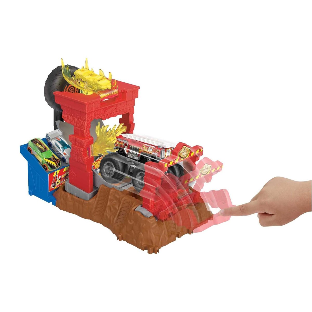 HW 5-Alarm wird durch unechte Flammen geschleudert, um einen Punkt zu treffen und das Feuer im Hot Wheels Monster Trucks Arena Smashers 5-Alarm Feuer-Crash-Challenge-Spielset zu löschen.