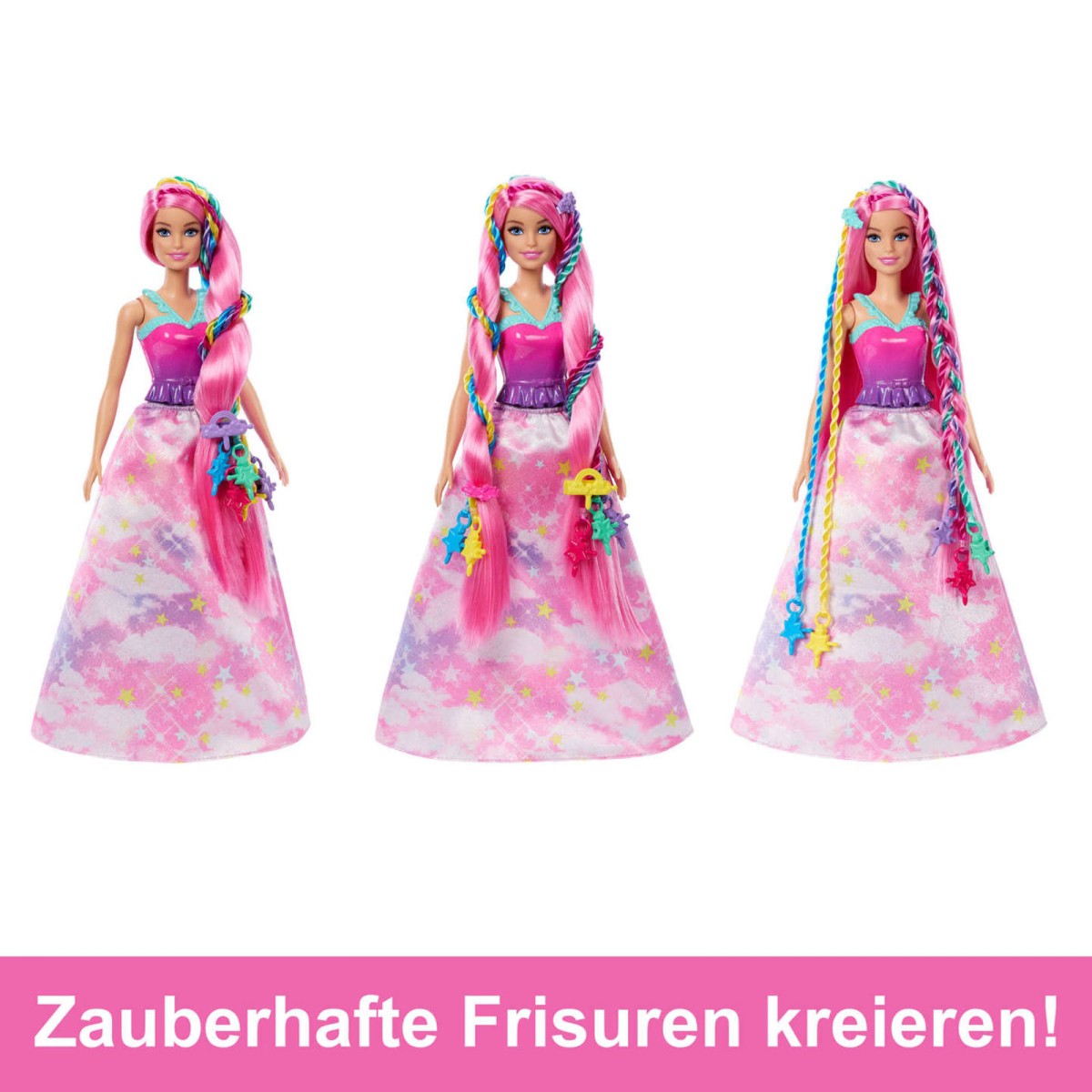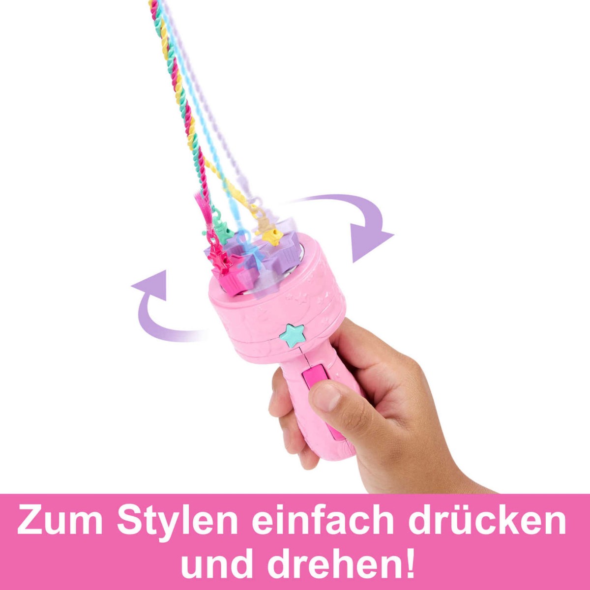 Neue Looks für Barbie gestalten! Wenn ihr über 20 cm langes pinkes Haar fantasievoll eingedreht und geflochten ist, wird die Frisur mit einem Clip gesichert.