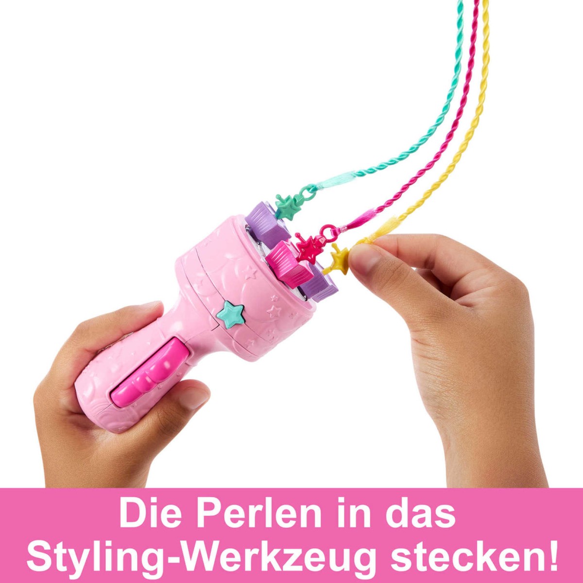 An den Enden der Regenbogen-Haarverlängerungen der Barbie-Puppe sind sternförmige Haarperlen angebracht. Haarperlen in das Styling-Werkzeug stecken und zum Flechten auf die Taste drücken! Mit dem Styling-Werkzeug wird Barbies Haar in schöne Flechtfrisuren verwandelt.