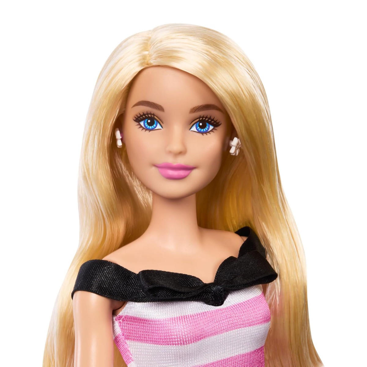 Diese Barbie-Puppe wird zur Feier des 65-jährigen Jubiläums von Barbie herausgebracht. Sie begeistert in einem pink-weiß gestreiften Kleid mit einer schwarzer Schleife am Ausschnitt. Die Perlenohrringe und pinken High Heels vervollständigen ihren Look! Diese Puppe ist ein tolles Geschenk für Kinder und Barbie-Fans jeden Alters.