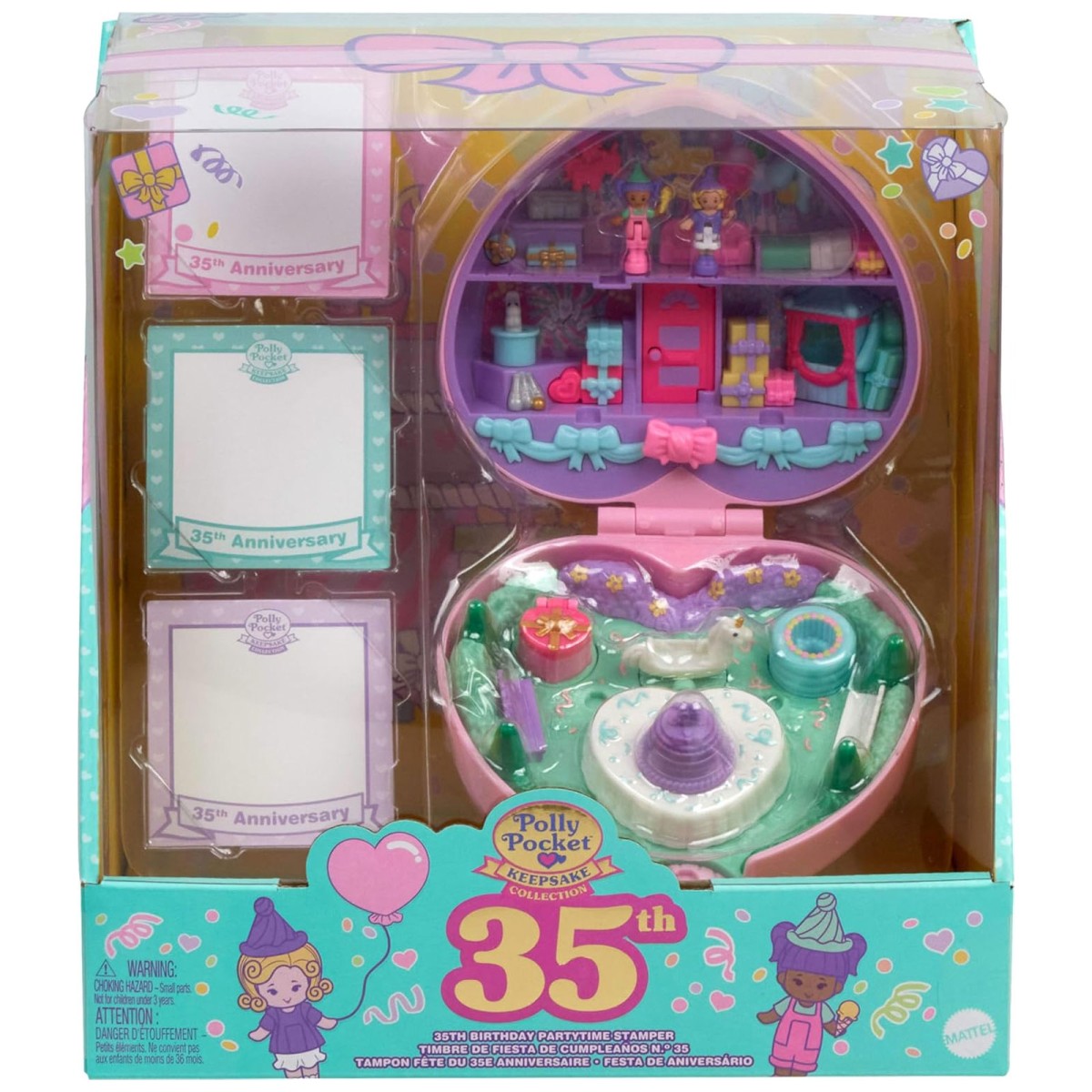 Produktinformationen "Mattel HWP20 - Polly Pocket - 35 Jahre Jubiläum – Partytime Stamper Compact Remake (1992) – Sammleredition mit Spielset, 2 Figuren uvm."