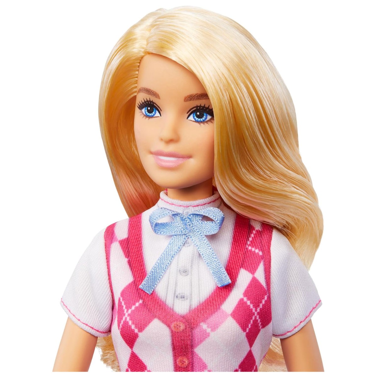 - Barbie kommt in einer rosa Argyle-Weste, Hosen, Stiefel und einen Helm