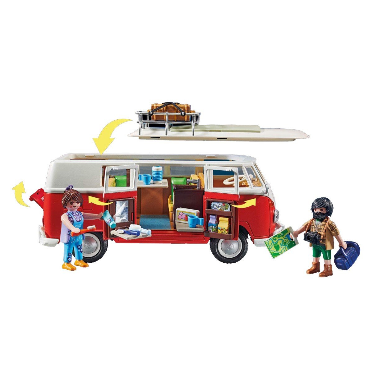 - 74-teiliges Spielfiguren-Set: 1 VW Bus, 2 Figuren, 71 Zubehörteile