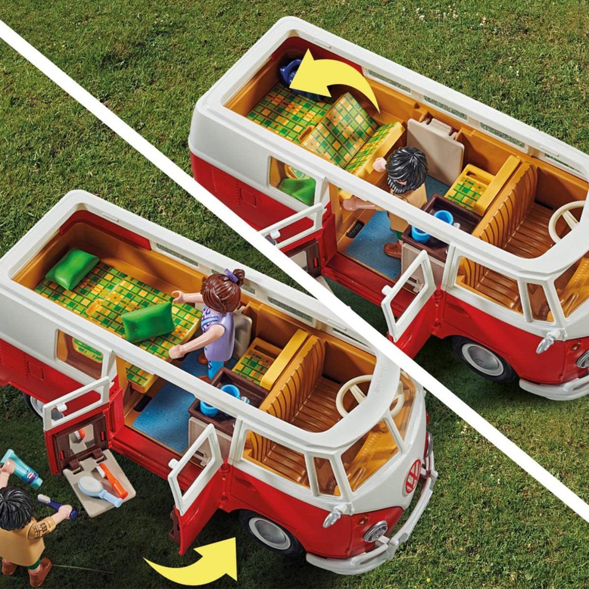 Genau wie beim Original aus den 50er und 60er Jahren begeistert das Spielzeugauto von PLAYMOBIL mit liebevollen Details und coolen Funktionen: Sitzbänke im typischen Karomuster, eine Mini-Küche mit Klapptisch und was wäre der T1 schon ohne eine umklappbare Rückbank?