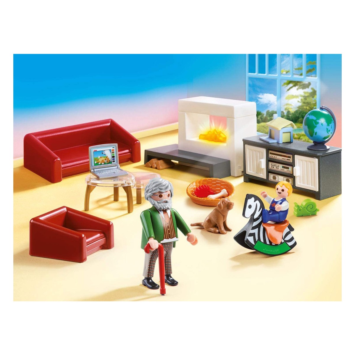 - PLAYMOBIL Gemütliches Wohnzimmer mit Großvater, Baby, Welpe und zahlreichem Zubehör für detailgetreues Nachspielen