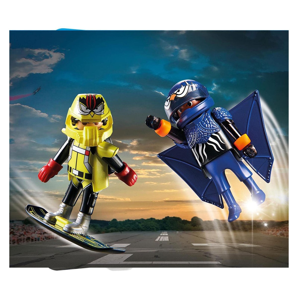 Um den Zuschauern eine tolle Show zu bieten, scheuen die mutigen Stuntleute kein Risiko. Während der eine mit seinem Hoverboard jedes Hindernis überwindet, lässt sich der andere in die Luft katapultieren und schwebt mit seinem Flightsuit wieder auf den Boden. Was für eine Show! PLAYMOBIL DuoPacks bieten doppelte Spielfreude. Zwei Figuren mit Accessoires sorgen für kleine und große Spielabenteuer.