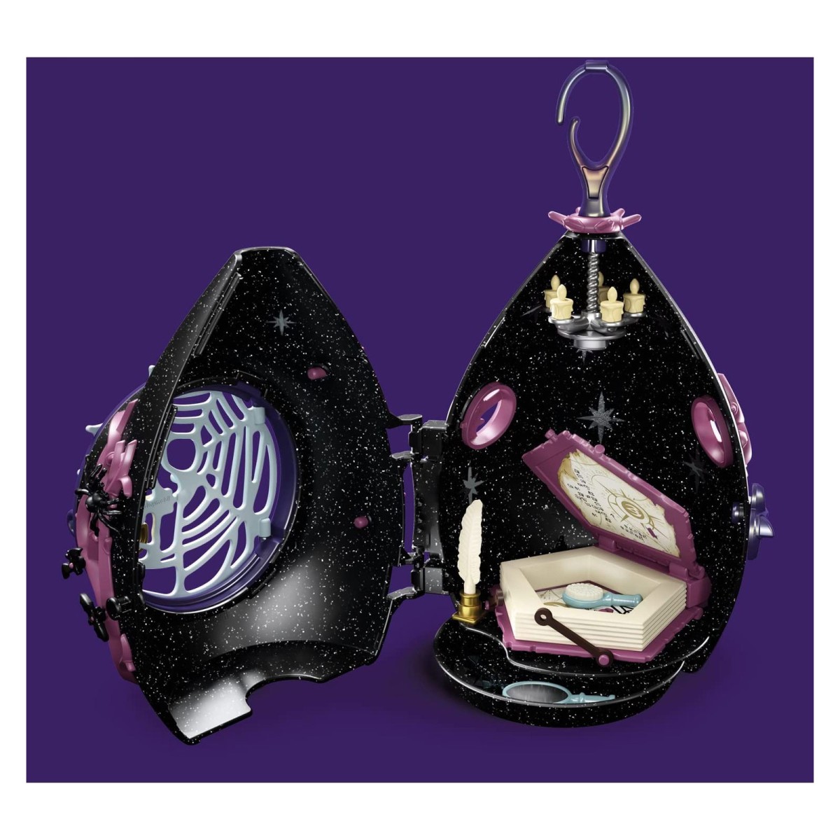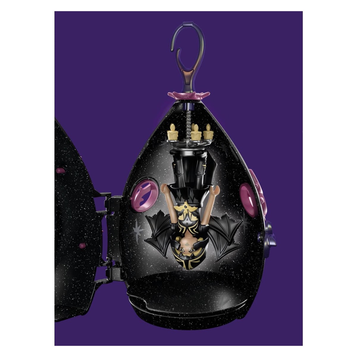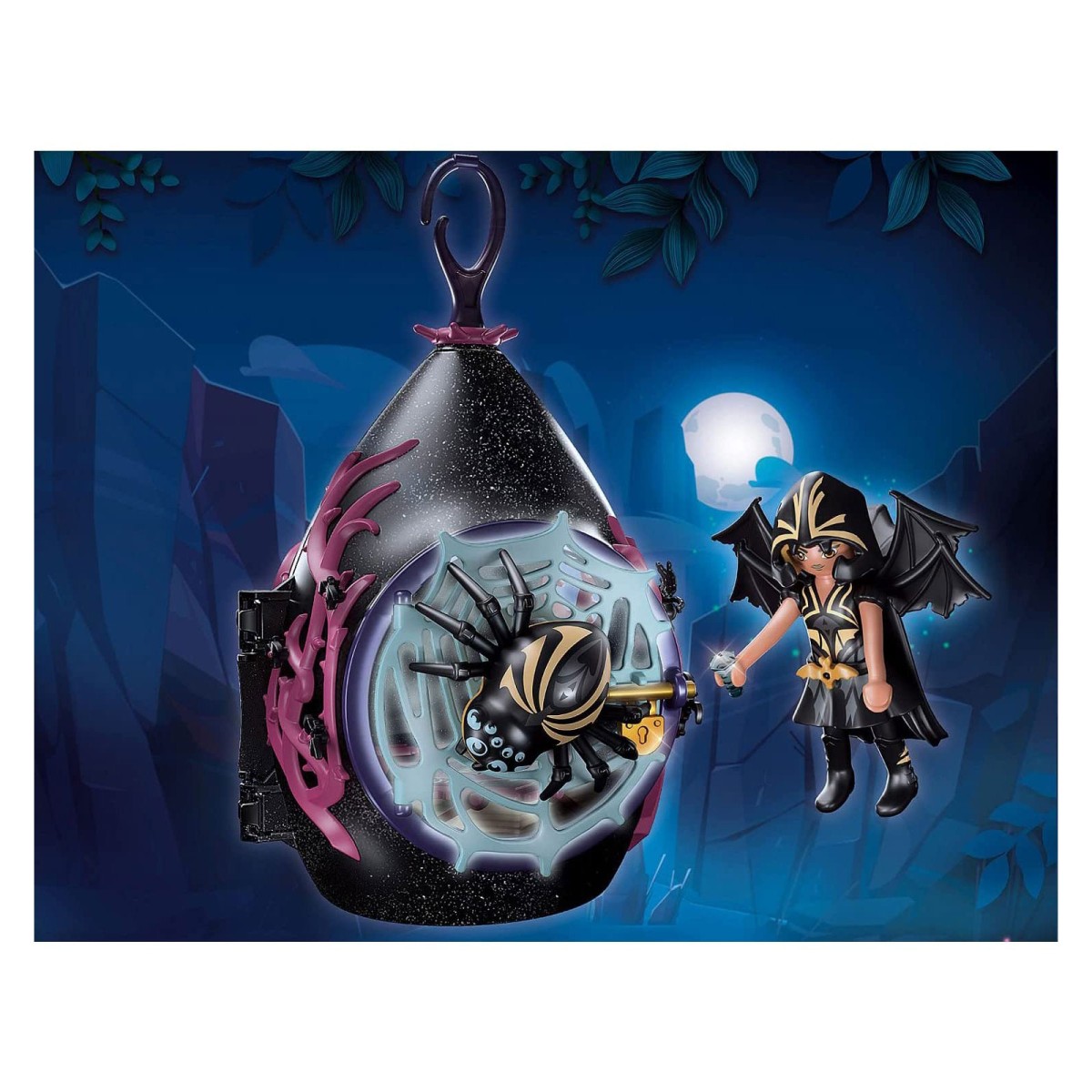 Nachdem sie wieder einige Kristalle gestohlen hat, kehrt die gemeine Bat Fairy am Abend in ihr schaurig-gemütliches Tropfenhäuschen zurück. Die kostbaren Steine verstaut sie im Geheimversteck und dann hängt sich die PLAYMOBIL-Fee kopfüber an den Kronleuchter – wie es sich für eine Fledermaus eben gehört. Ihr Seelentier, eine gruselige Spinne, macht es sich an der Spinnennetztür gemütlich. An ihr wird sich so schnell niemand vorbei wagen!